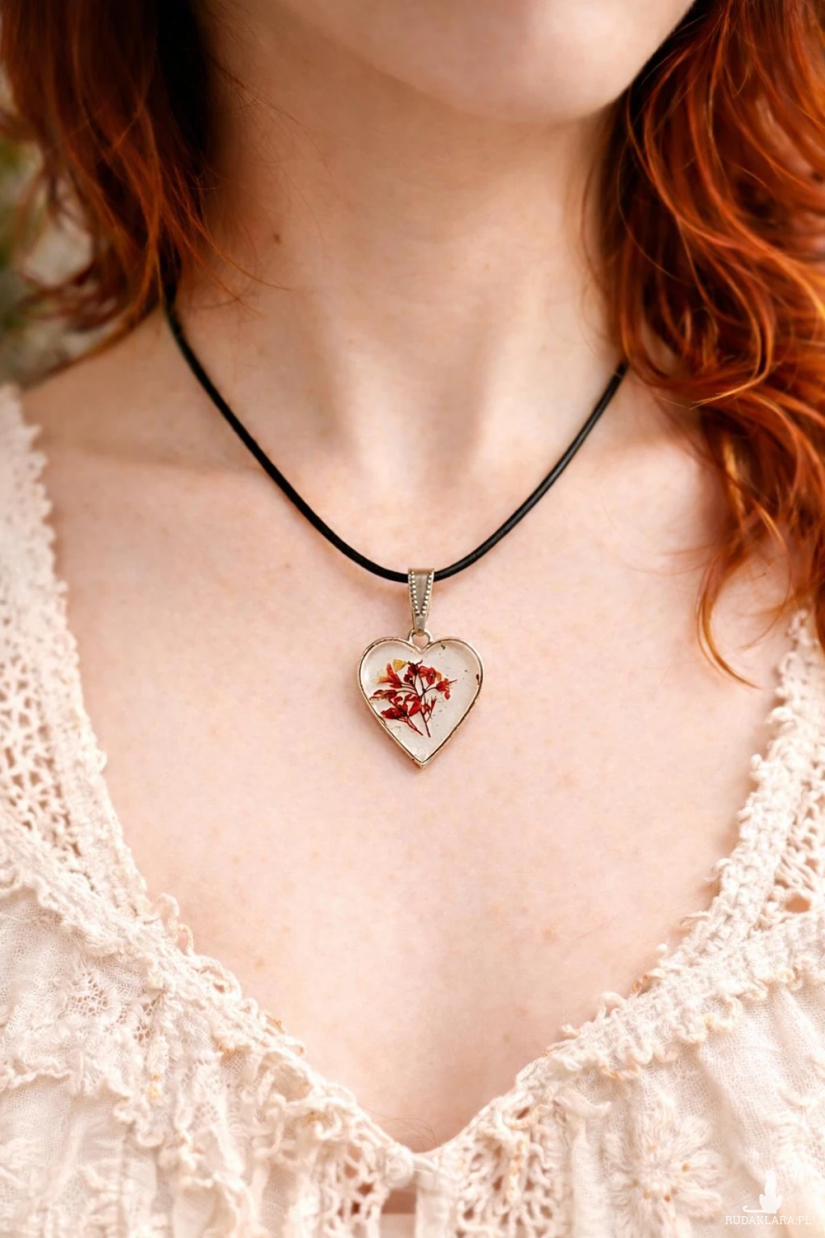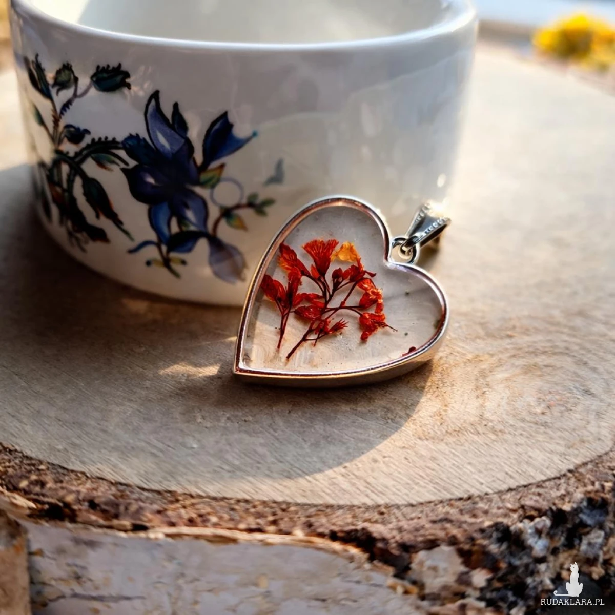 Subtelny i wyjątkowy wisior z żywicy w kształcie serca, wykonany ręcznie z naturalnych czerwonych kwiatów smagliczki zatopionych w krystalicznej żywicy. Srebrna oprawa podkreśla delikatność kompozycji i dodaje elegancji.