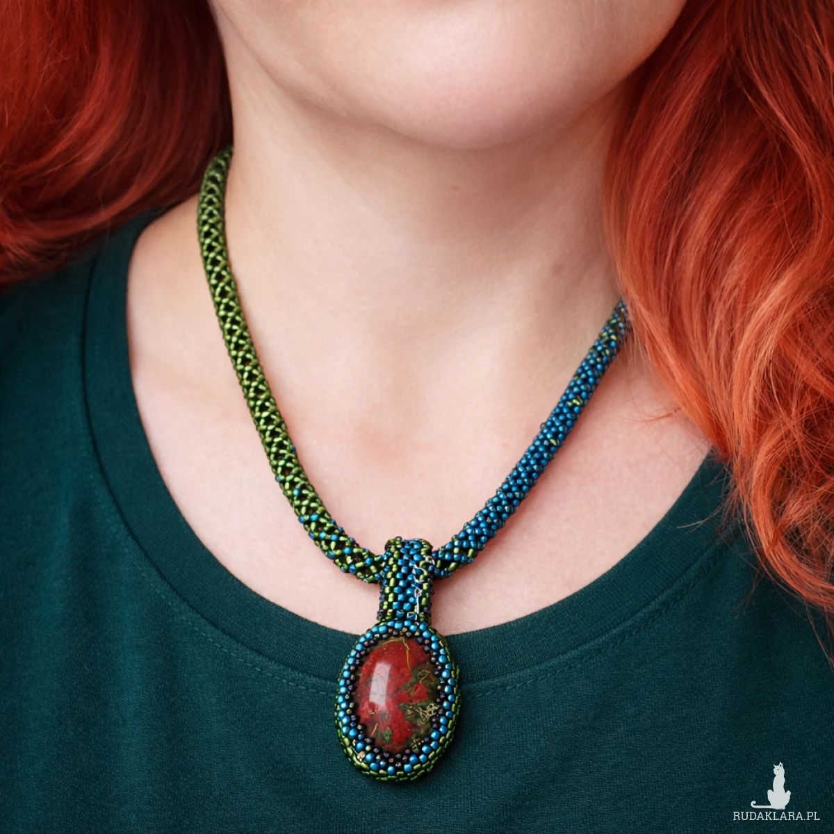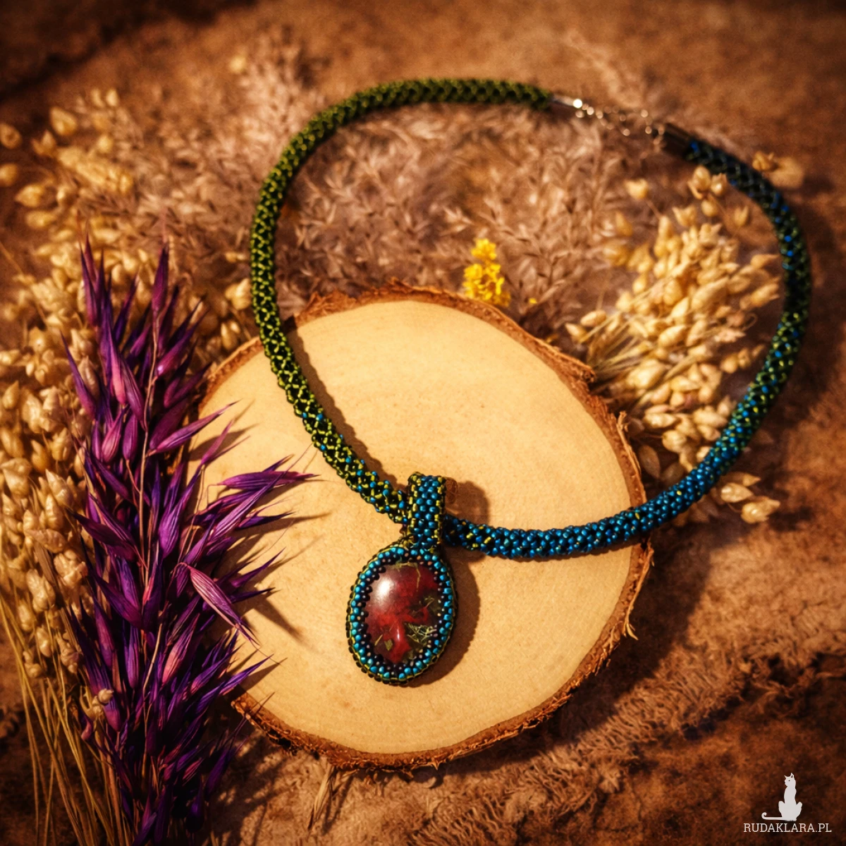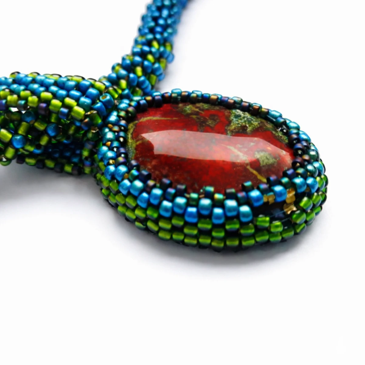 Unikatowy naszyjnik handmade z naturalnym jaspisem Smocza Krew, ręcznie obszyty tysiącami koralików. Wyrazista biżuteria etniczna w odcieniach turkusu, oliwki i czerwieni.