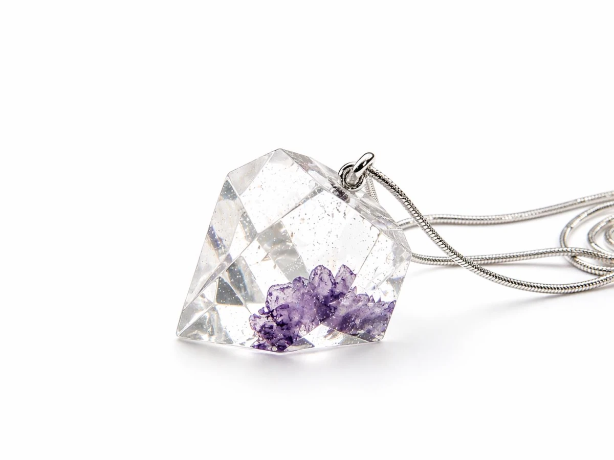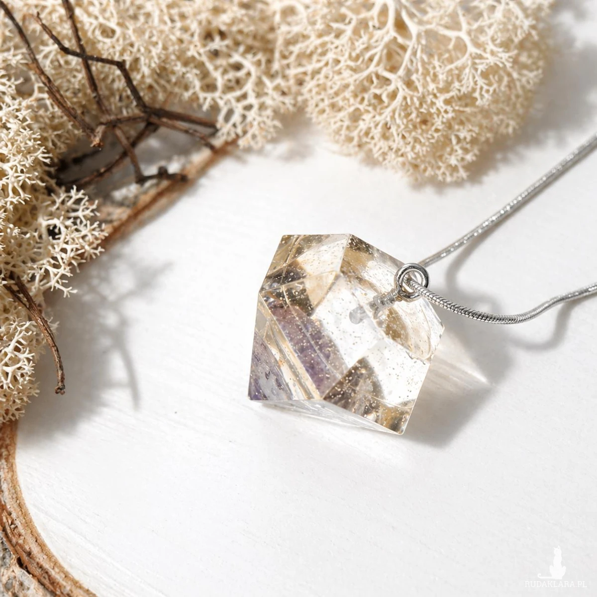 Ręcznie wykonany wisiorek z żywicy w formie diamentu z zatopionymi fragmentami ametystu to wyjątkowa biżuteria łącząca nowoczesny design z naturalnym pięknem kamienia. Subtelny połysk i geometryczna forma sprawiają, że przyciąga uwagę i dodaje stylu każdej stylizacji.