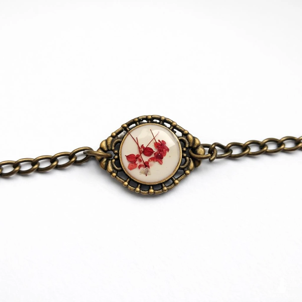 Elegancka i delikatna bransoletka z żywicy z naturalnymi czerwonymi kwiatami smagliczki, zatopionymi w krystalicznej żywicy na jasnym tle. Całość osadzona w oprawie w kolorze starego złota, co nadaje biżuterii wyjątkowego, vintage charakteru.