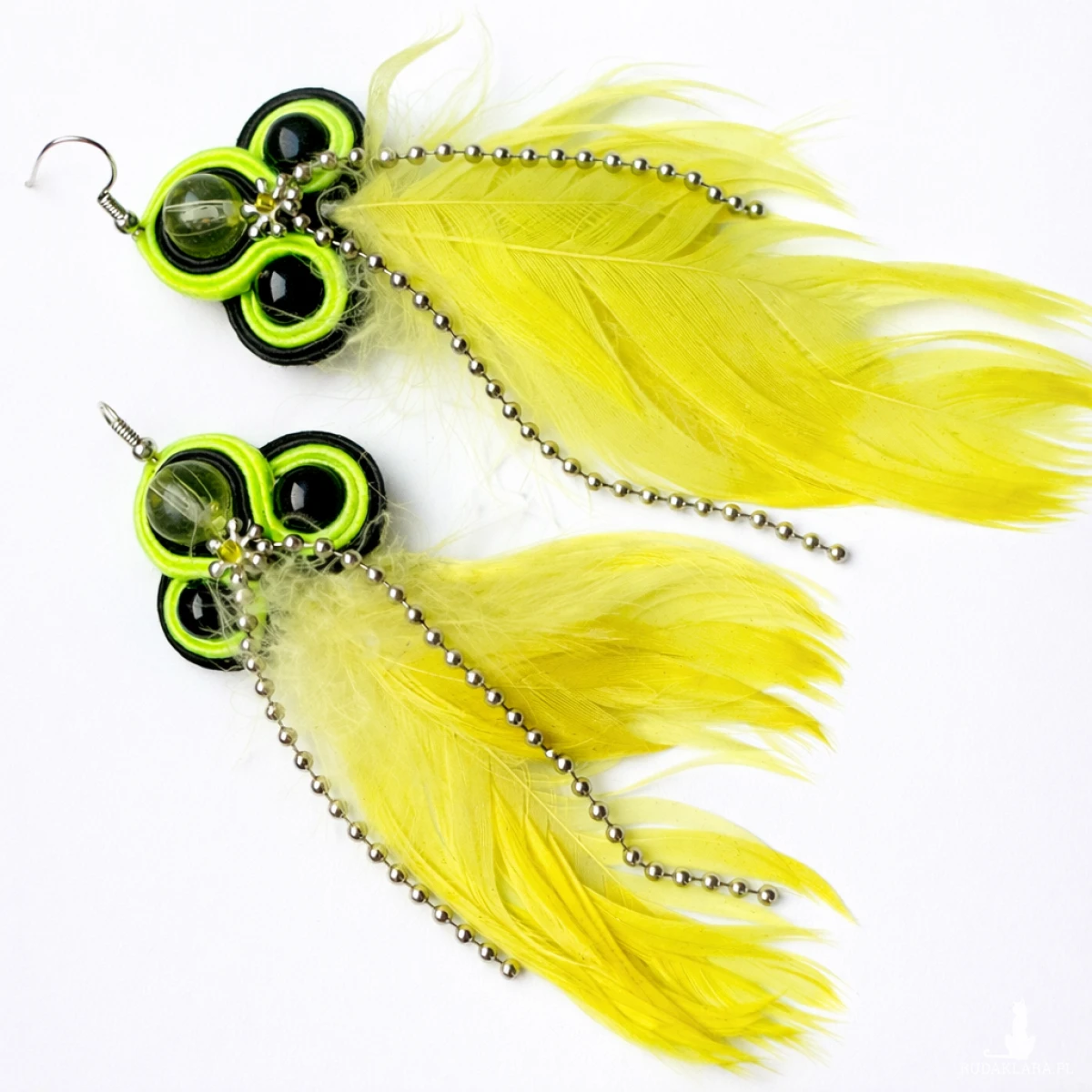 Kolczyki AURELIA to wyjątkowa biżuteria handmade wykonana metodą haftu sutasz. Połączenie delikatnych piór, koralików oraz precyzyjnie ułożonych sznurków soutache tworzy lekką i efektowną formę idealną do stylizacji boho.