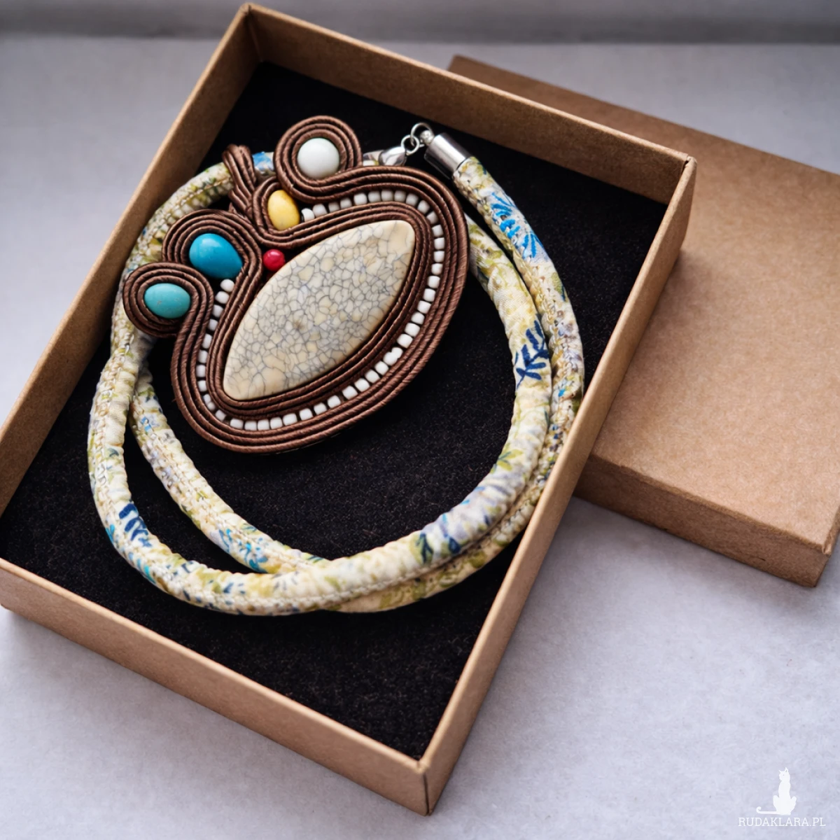 Ten wyjątkowy naszyjnik handmade został wykonany techniką soutache (sutasz), łącząc elegancję z naturalnym, artystycznym charakterem. Centralnym elementem biżuterii jest kremowy kamień o subtelnej strukturze, otoczony precyzyjnie ułożonymi sznurkami sutasz oraz drobnymi koralikami.