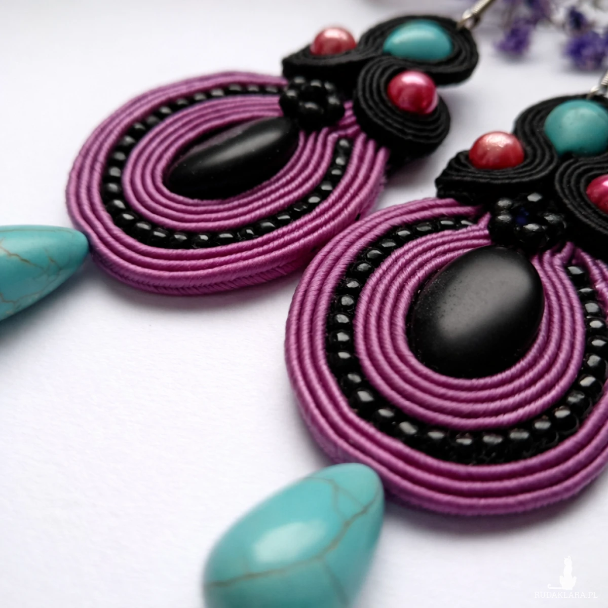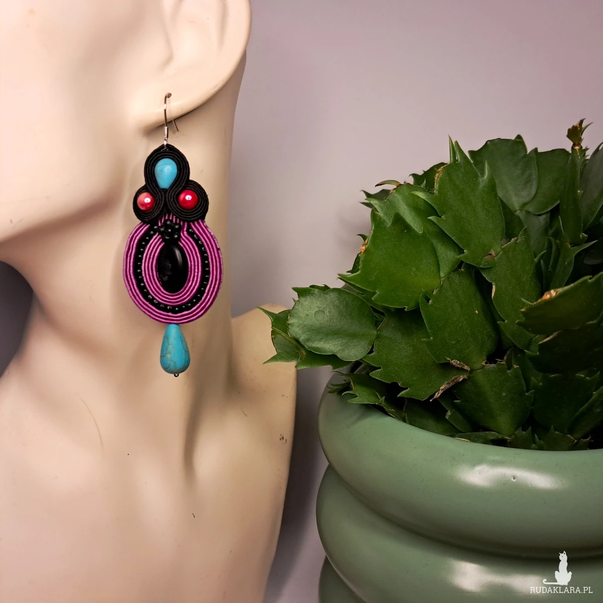 Unikatowe kolczyki wykonane metodą haftu sutasz to propozycja dla kobiet ceniących oryginalną, artystyczną biżuterię handmade. Połączenie intensywnej barwy sznurków soutache z eleganckim czarnym kaboszonem oraz dekoracyjną turkusową kroplą tworzy wyjątkowy, przyciągający wzrok dodatek.