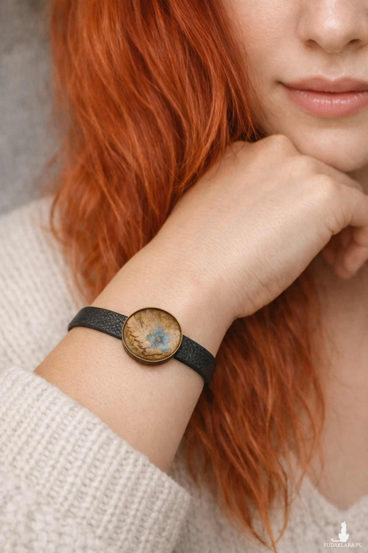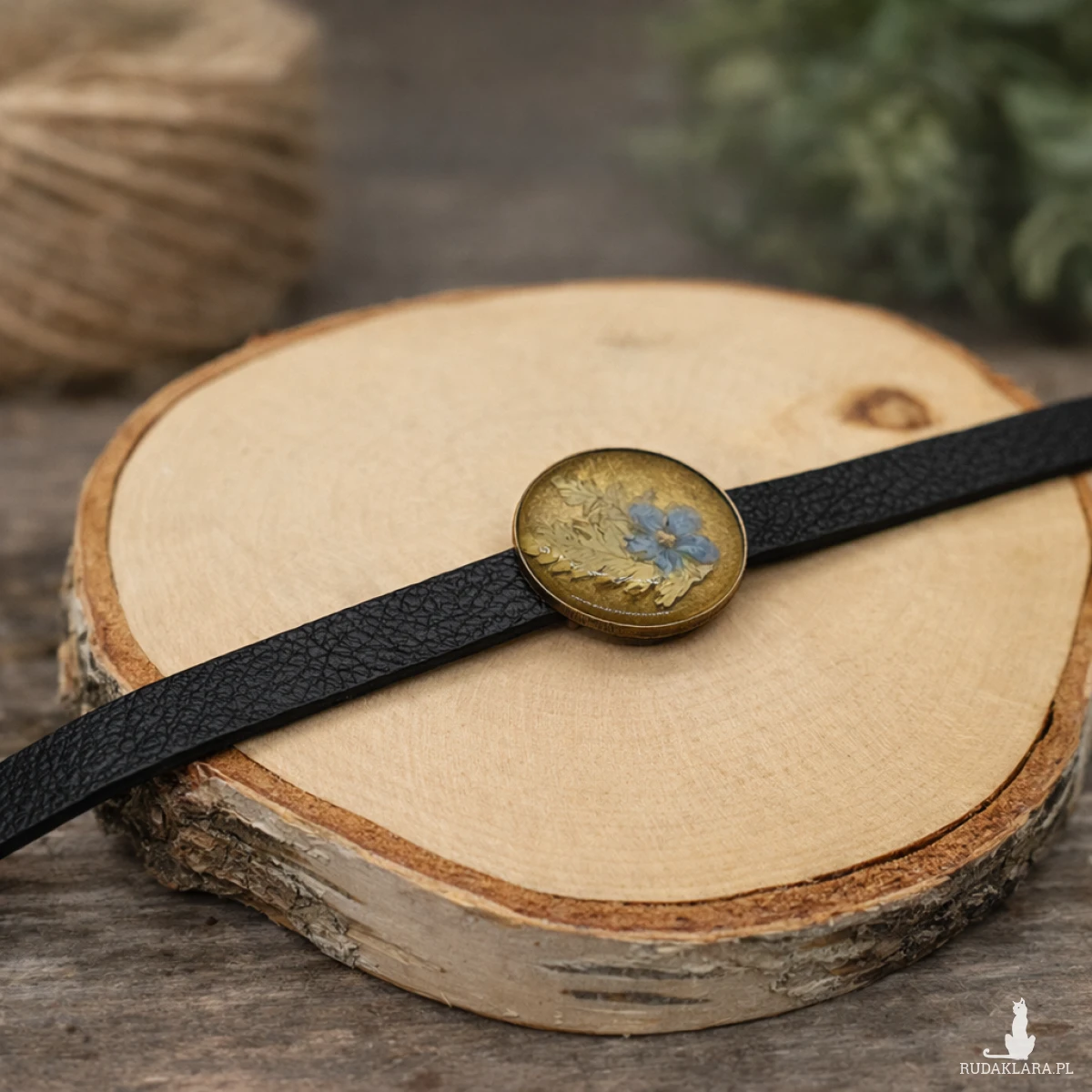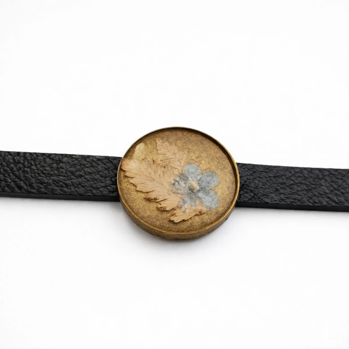 Każda bransoletka jest unikalna – kompozycja roślin oraz struktura żywicy sprawiają, że nie ma dwóch identycznych egzemplarzy. Oprawa w kolorze starego złota nadaje biżuterii elegancki charakter i doskonale komponuje się ze skórzanym paskiem.