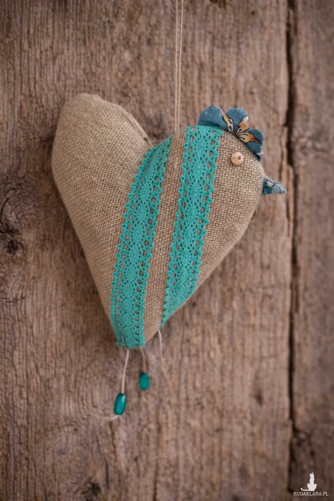 Lniana kura (lub kogut) - uszyta z grubego, surowego lnu. Grzebień i dziób z lnu o niebieskiej barwie z delikatnym kolorowym motywem. Koralikowe oczy i nóżki dopasowane do całości. Tułów ozdobiony lnianą koronką. Wymiary: szer. 15 cm/ dł. 23cm. Kura może być doskonałym elementem dekoracyjnym wnętrza w stylu rustykalnym, boho, skandynawskim.