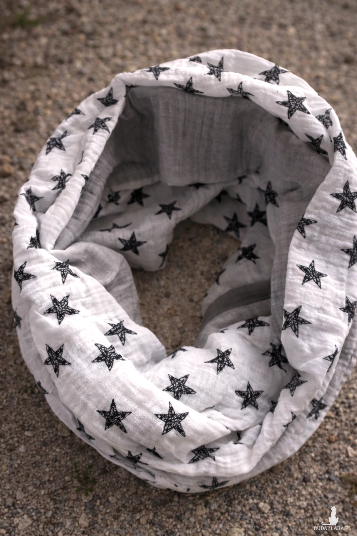 Dwustronny muślinowy komin. Dominujące kolory to biel, czerń i szary . Z jednej strony czarne gwiazdki na białym tle (wyglądają jak ręcznie narysowane cienkopisem), z drugiej strony - materiał jednolity - szary. Komin jest szeroki - 2x33 cm, długość- 140 cm (obwód), bardzo przyjemny w dotyku. Wykonany ze 100% bawełny. Doskonałe uzupełnienie wielu stylizacji. Polecam.