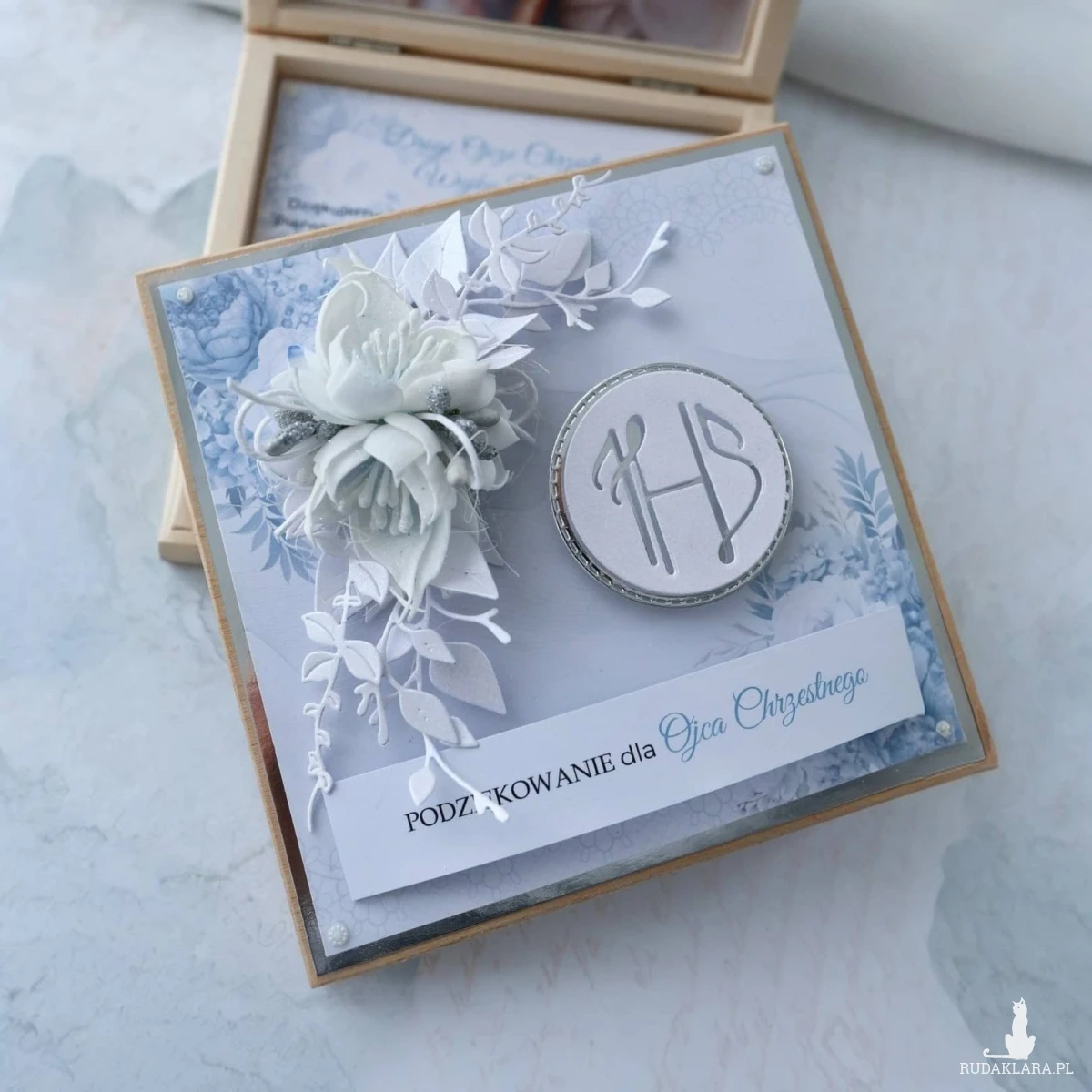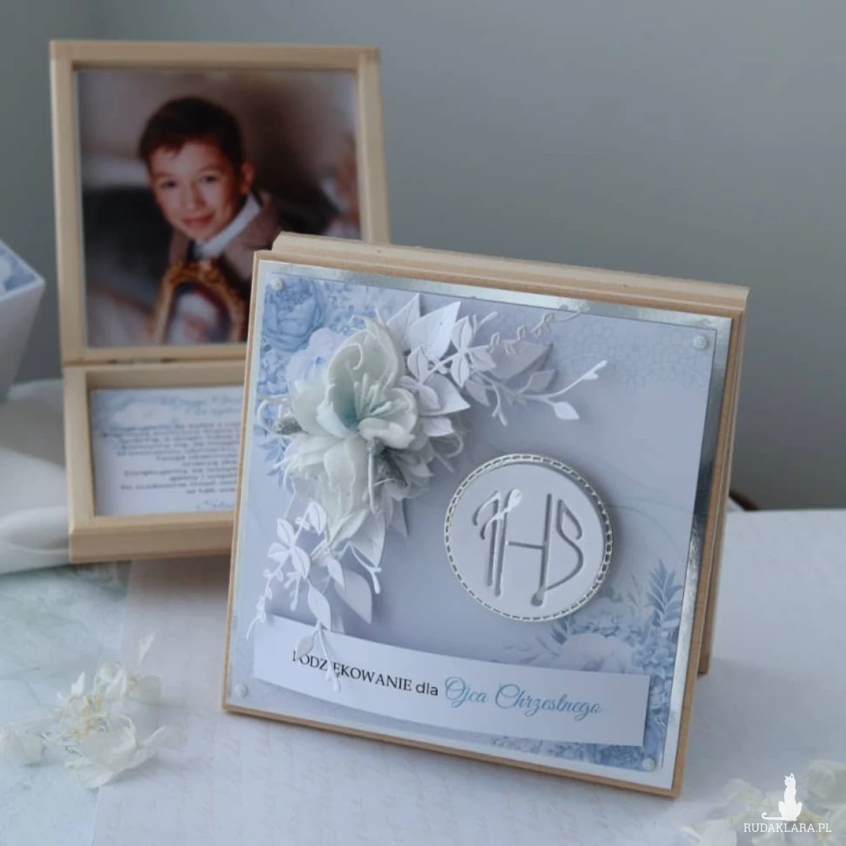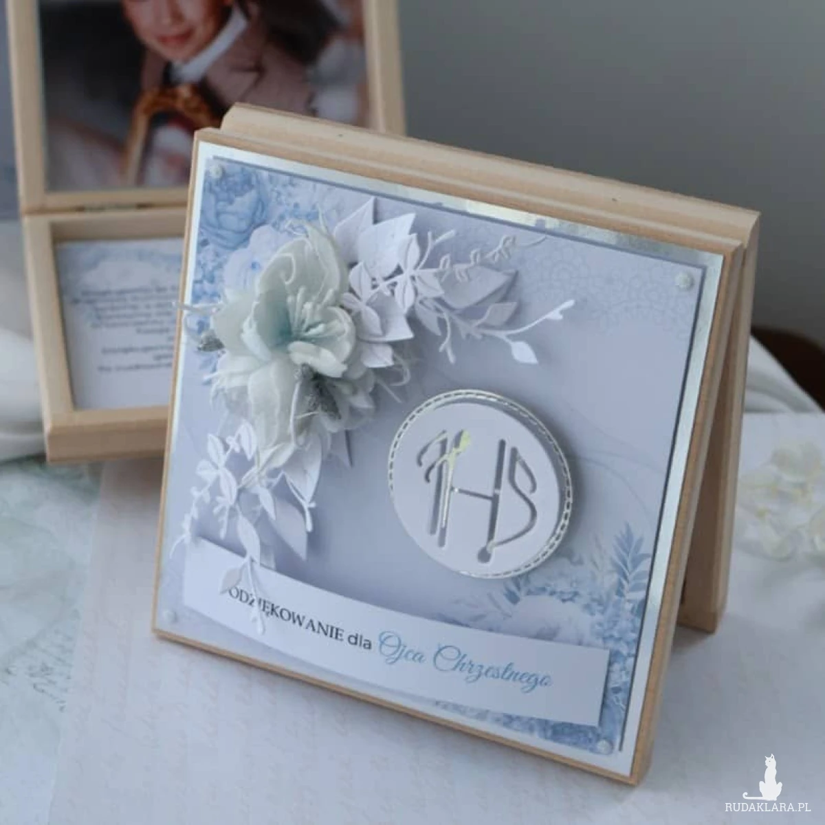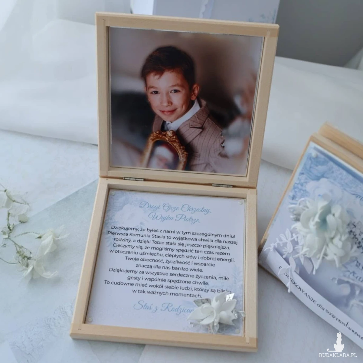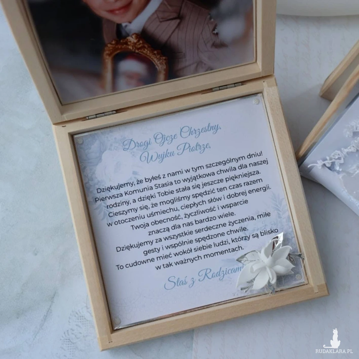 Drewniane pudełko idealnie sprawdzi się jako Podziękowanie dla Rodziców Chrzestnych z okazji Pierwszej Komunii Świętej dla chłopca.