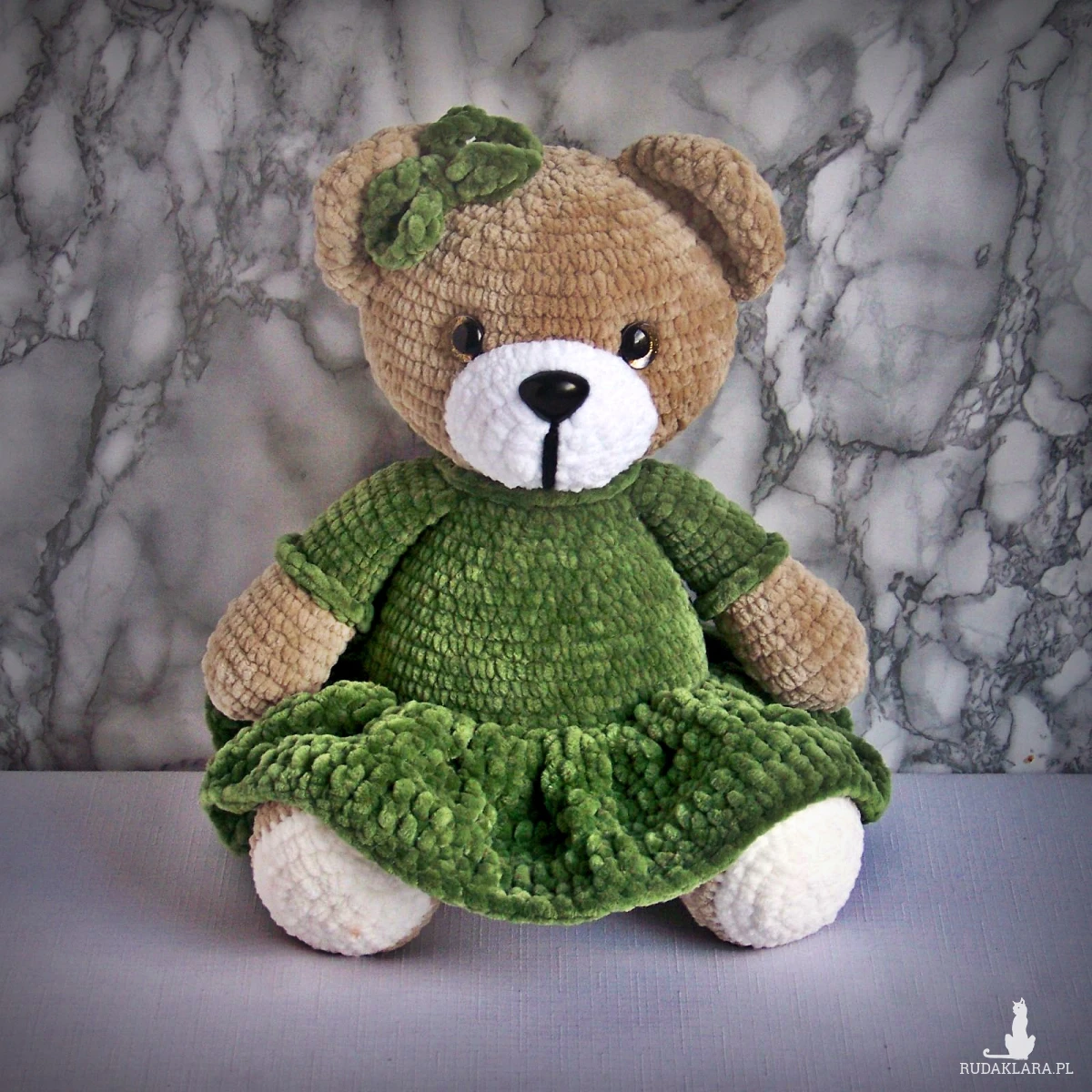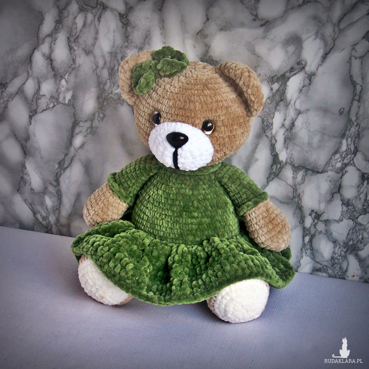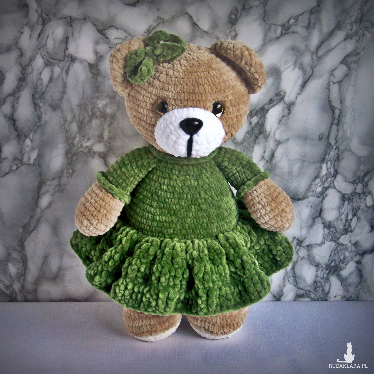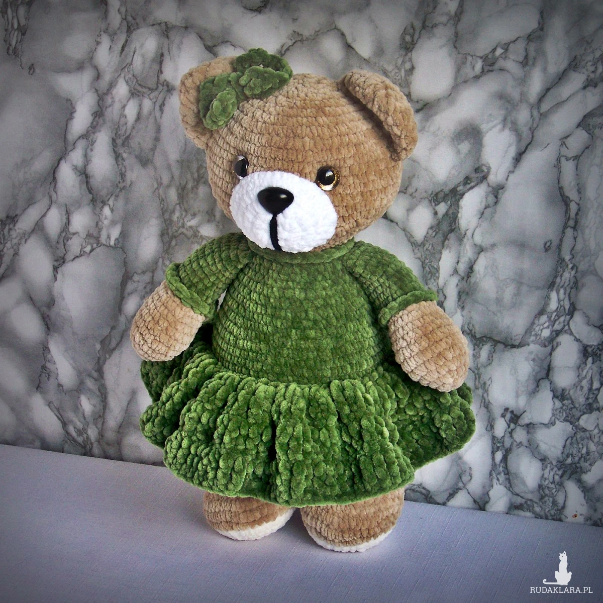 Szydełkowy miś 32cm w oliwkowej sukience (na zamówienie)