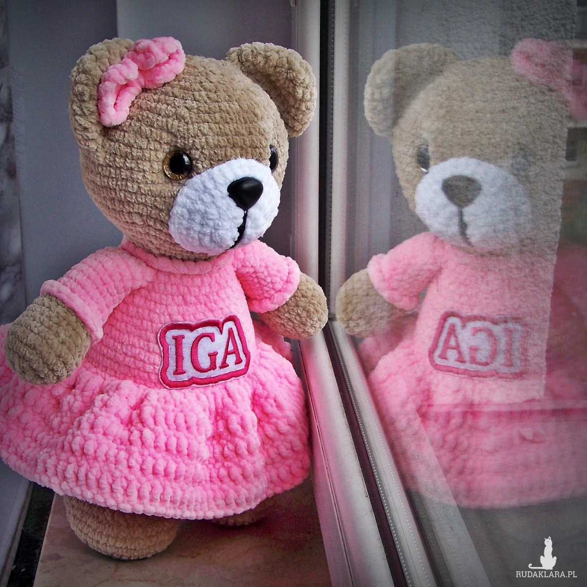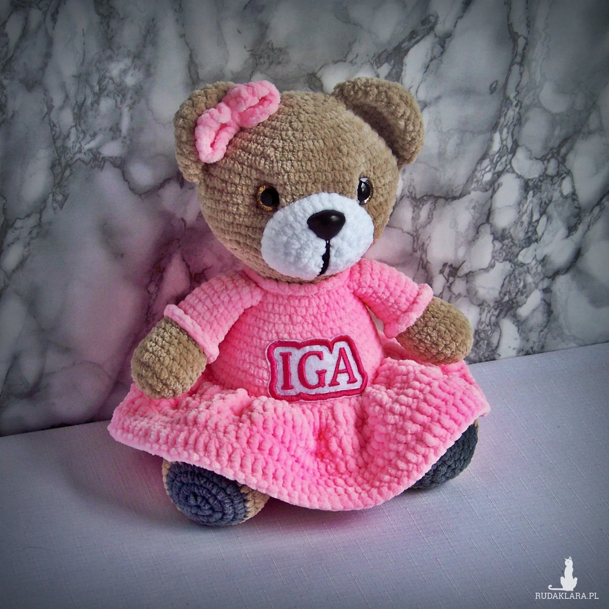 Miś jest zrobiony z bardzo delikatnej i miłej w dotyku włóczki, jest to certyfikowana włóczka antyalergiczna w 100% bezpieczna dla skóry. Nosek i oczka są trwale zaklipsowane, nie da się ich wyrwać. Imię na misiu będzie zrobione takie, jakie będzie potrzebowała osoba zamawiająca misia. Zamiast imienia może też być inny napis, nie może tylko on być zbyt długi. Miś może być misiem do przytulania, ale także może być misiem dekoracyjnym, który doda ciepła i uroku każdemu wnętrzu 😊 Wysokość misia to ok. 31-32 cm (na stojąco).
