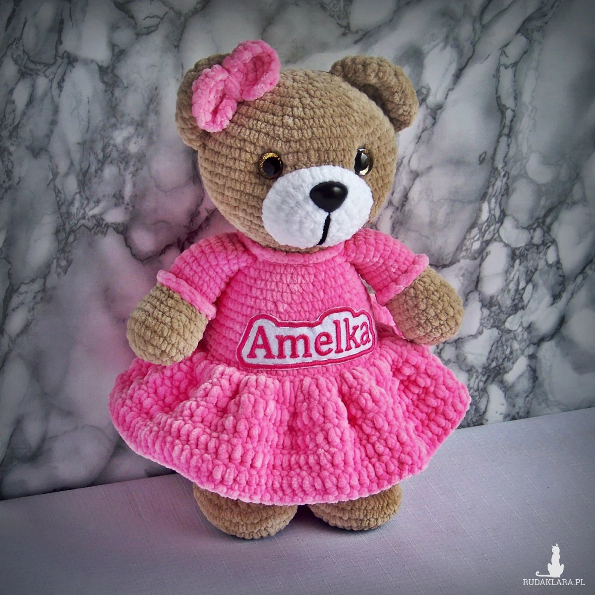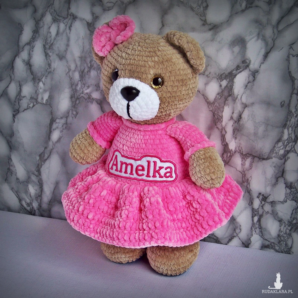Szydełkowy miś Amelka 32cm w ciemnoróżowej sukience (na zamówienie)