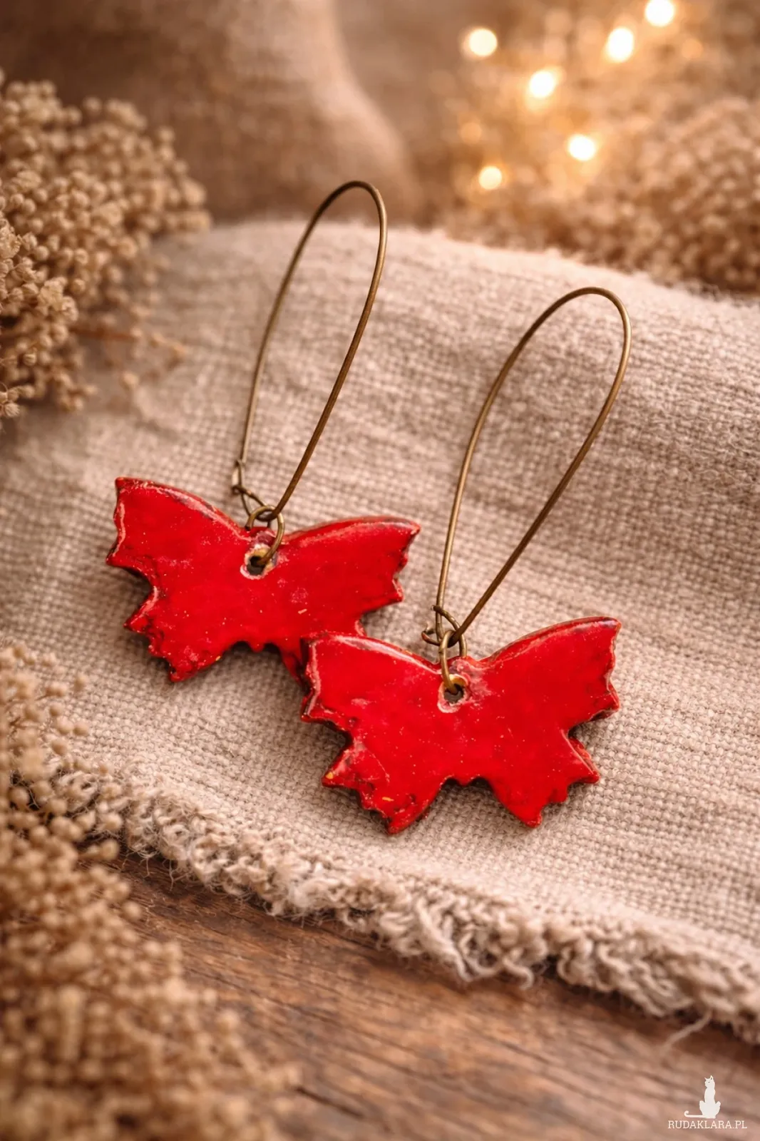 Kolczyki w kształcie motyli zostały ręcznie ulepione z gliny samoutwardzalnej. Dominującym kolory to: soczysta czerwień. Postarzane. Zabezpieczone lakierem z połyskiem.Wymiary: ok. 3 cm/ 6 cm (długość z biglami w kolorze starego złota). Bigle ze stali szlachetnej, bez niklu i ołowiu.