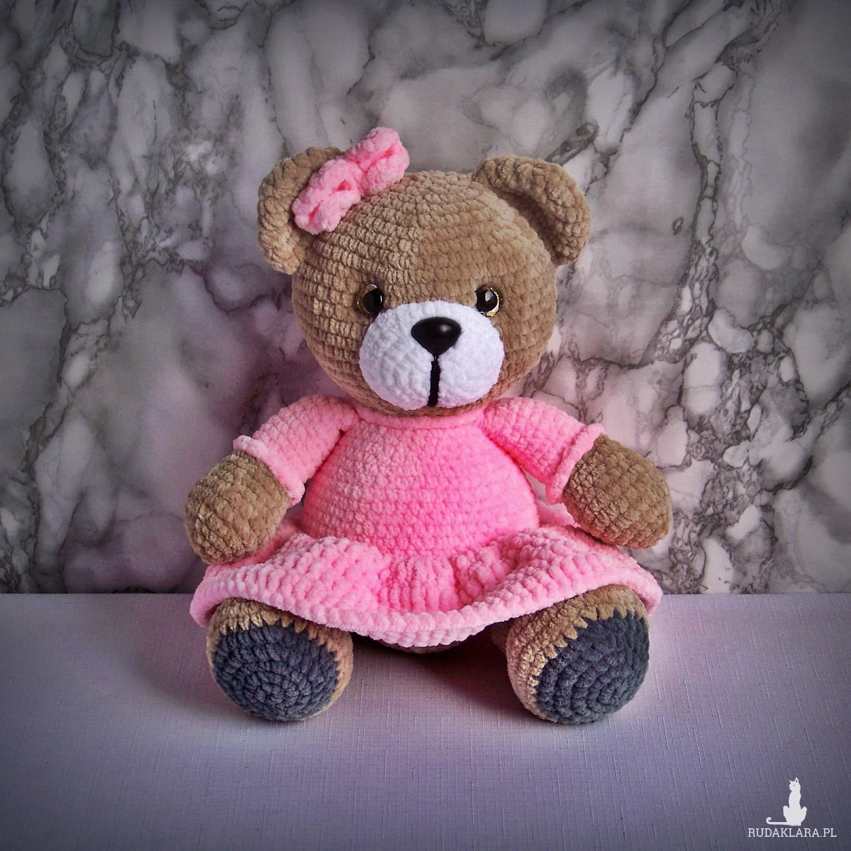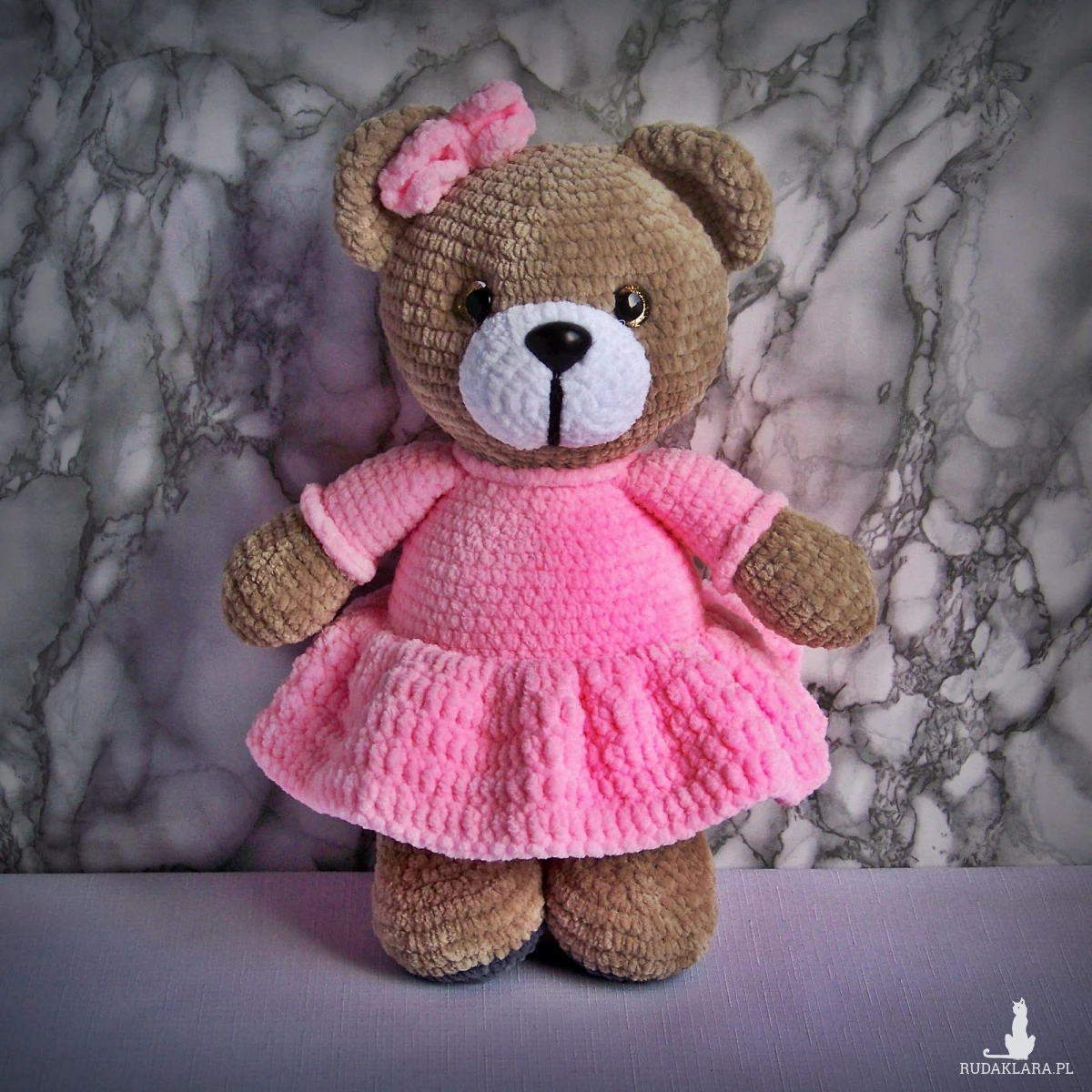 Szydełkowy miś 32cm w różowej sukience (na zamówienie)