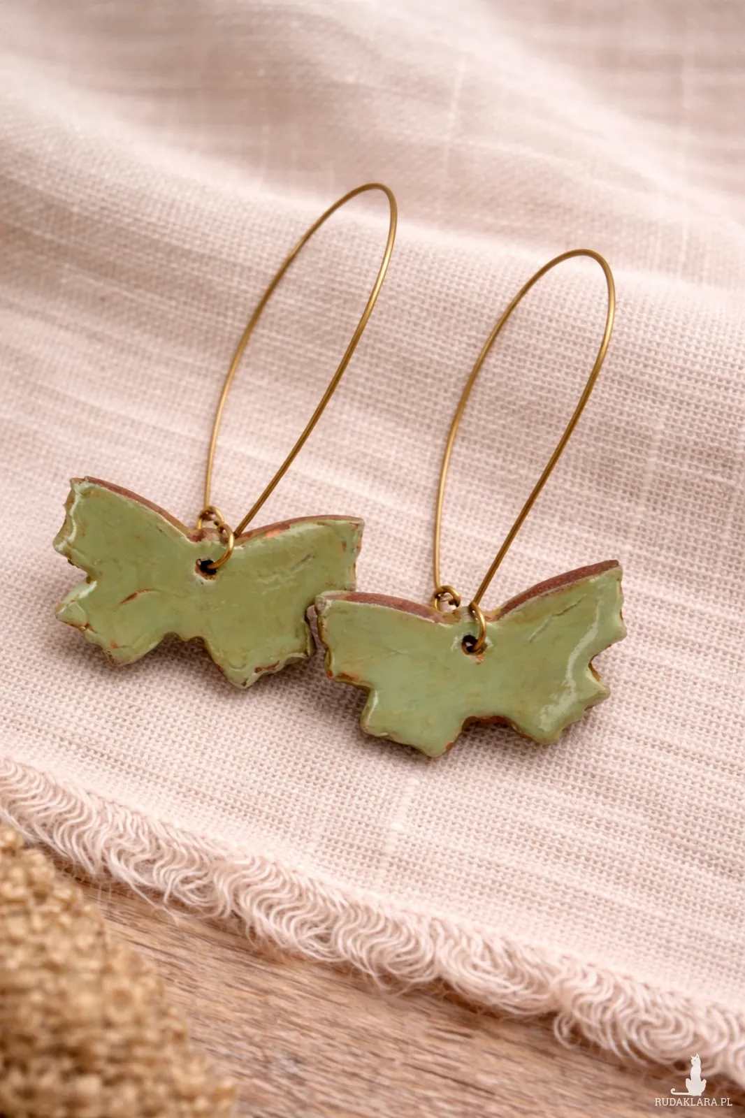 Kolczyki w kształcie motyli zostały ręcznie ulepione z gliny samoutwardzalnej. Dominującym kolory to: postarzana mięta. Zabezpieczone lakierem z połyskiem.Wymiary: ok. 3 cm/ 6 cm (długość z biglami w kolorze starego złota). Bigle ze stali szlachetnej, bez niklu i ołowiu.