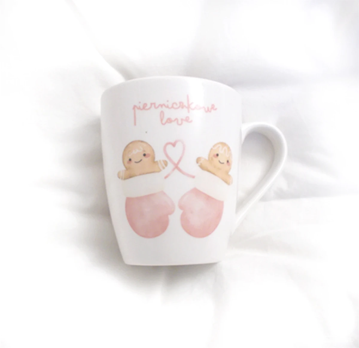 Nowy, oryginalny kubeczek z uchem, porcelanowy, ozdobiony pastelowym wzorem i napisem "Pierniczkowe Love", pojemność ok. 360 ml. Ceramika może posiadać drobne niedoskonałości typowe dla tego typu produktów (kropki, itp). Nadaje się do zmywarek i mikrofalówek.