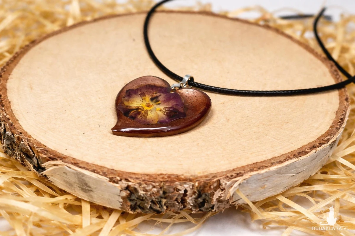 Wyjątkowy wisiorek wykonany ręcznie z wysokiej jakości żywicy epoksydowej. W jego wnętrzu został zatopiony naturalny fiołek trójbarwny zwany bratkiem, który tworzy subtelną i romantyczną kompozycję.