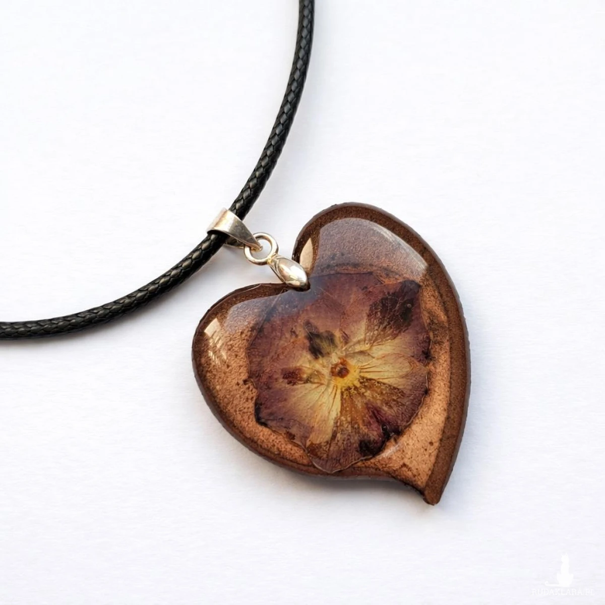 Biżuteria ma kształt serca i utrzymana jest w ciepłej, brązowo-metalicznej tonacji, co nadaje jej eleganckiego i lekko vintage charakteru. To doskonały wybór dla osób ceniących naturę, rękodzieło oraz niepowtarzalne dodatki.