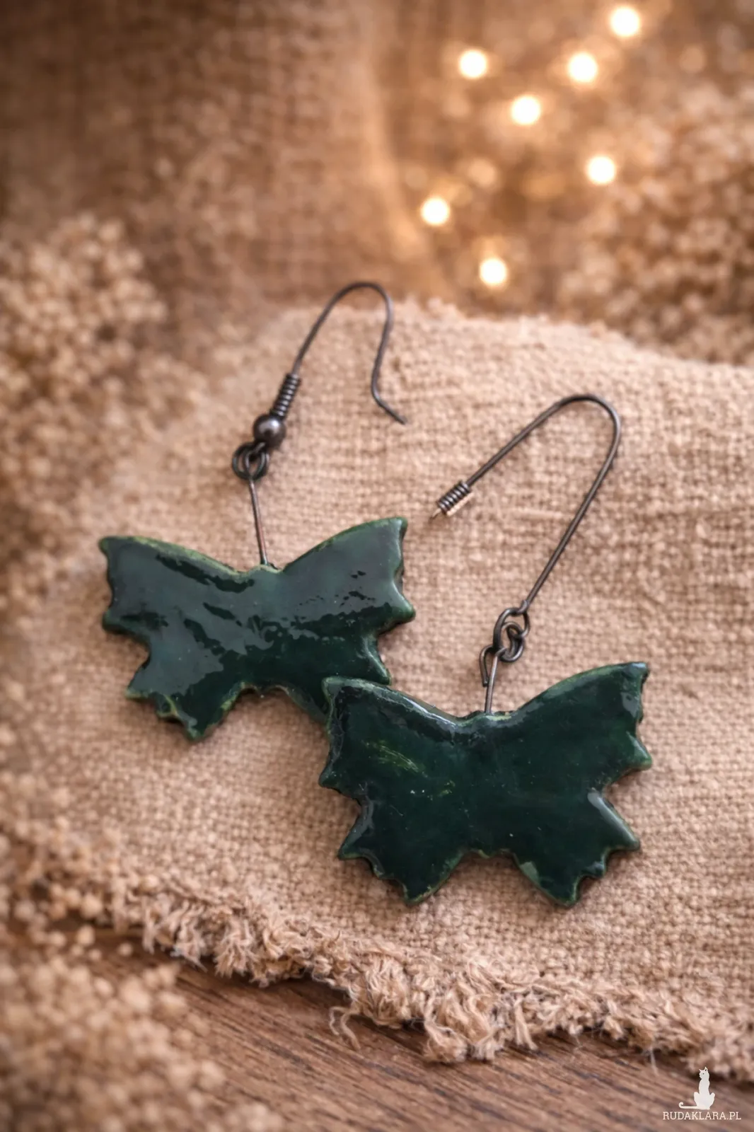 Kolczyki w kształcie motyli zostały ręcznie ulepione z gliny samoutwardzalnej. Zabezpieczone lakierem z połyskiem.Wymiary: ok. 3 cm/ 6 cm (długość z biglami w kolorze platyny). Bigle ze stali szlachetnej, bez niklu i ołowiu.