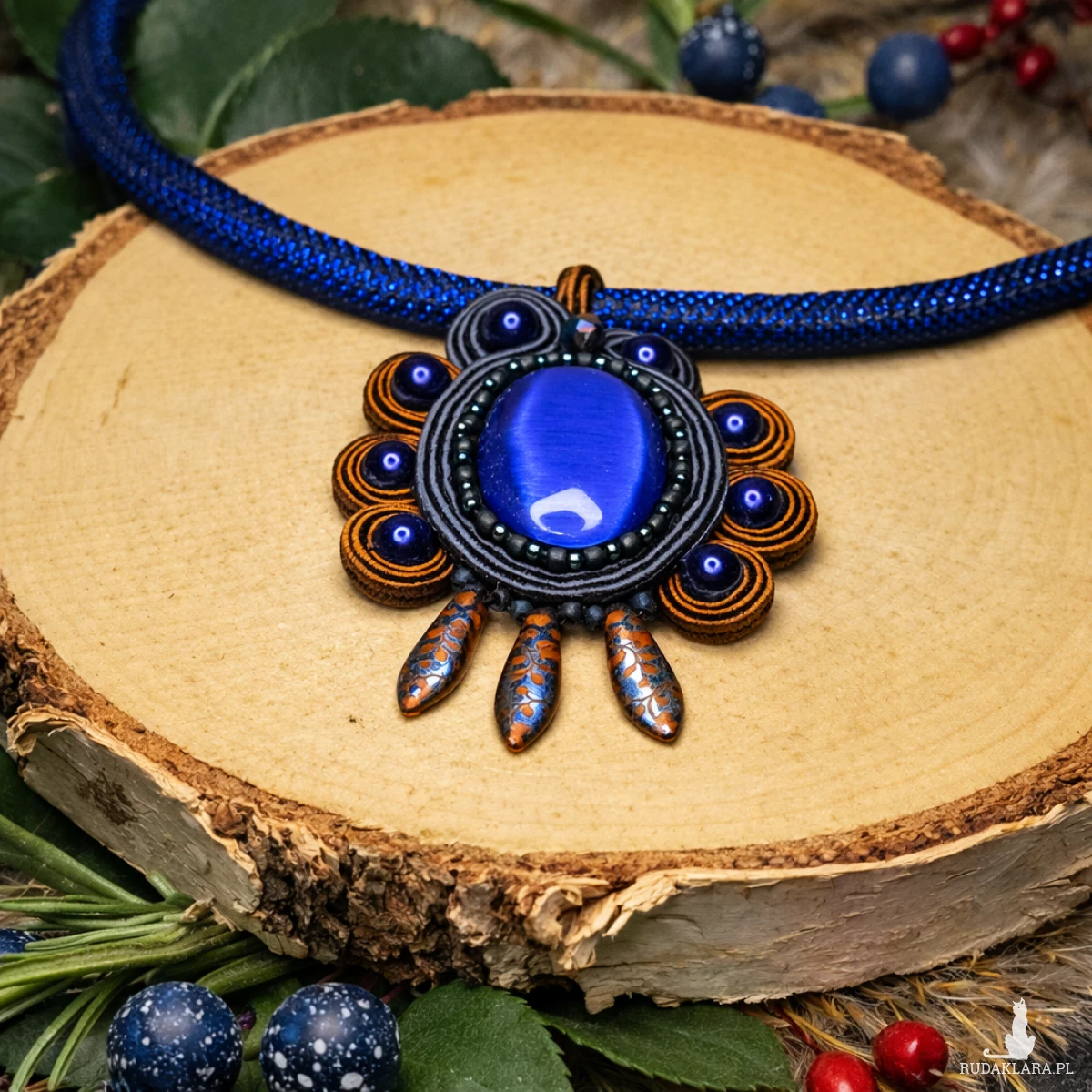 Ręcznie wykonany komplet biżuterii sutasz w eleganckim połączeniu chabrowego i brązu. Zestaw zawiera kolczyki oraz naszyjnik z efektownym kaboszonem typu kocie oko – idealny dodatek na wyjątkowe okazje lub oryginalny prezent.