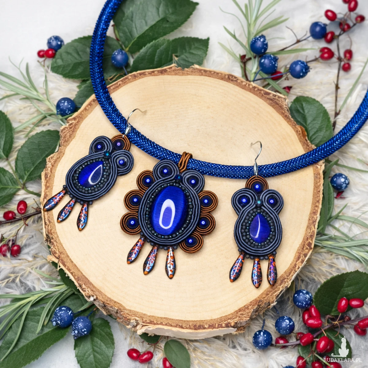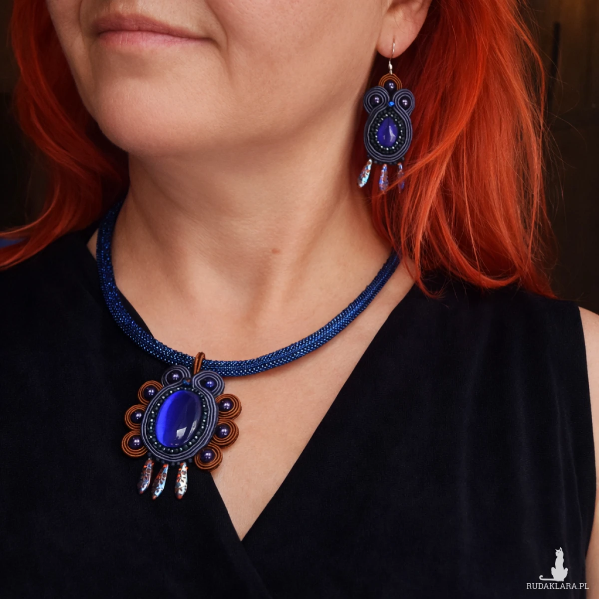 Unikalny komplet biżuterii sutasz składający się z kolczyków oraz naszyjnika, wykonany ręcznie z najwyższą dbałością o detale. Zestaw utrzymany jest w eleganckiej kolorystyce chabru i brązu, dzięki czemu doskonale podkreśli zarówno codzienne, jak i wieczorowe stylizacje.