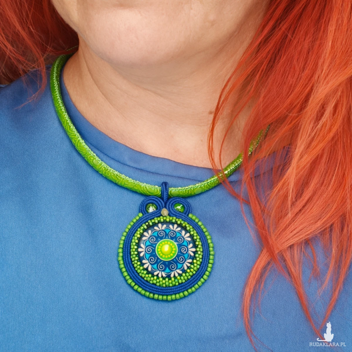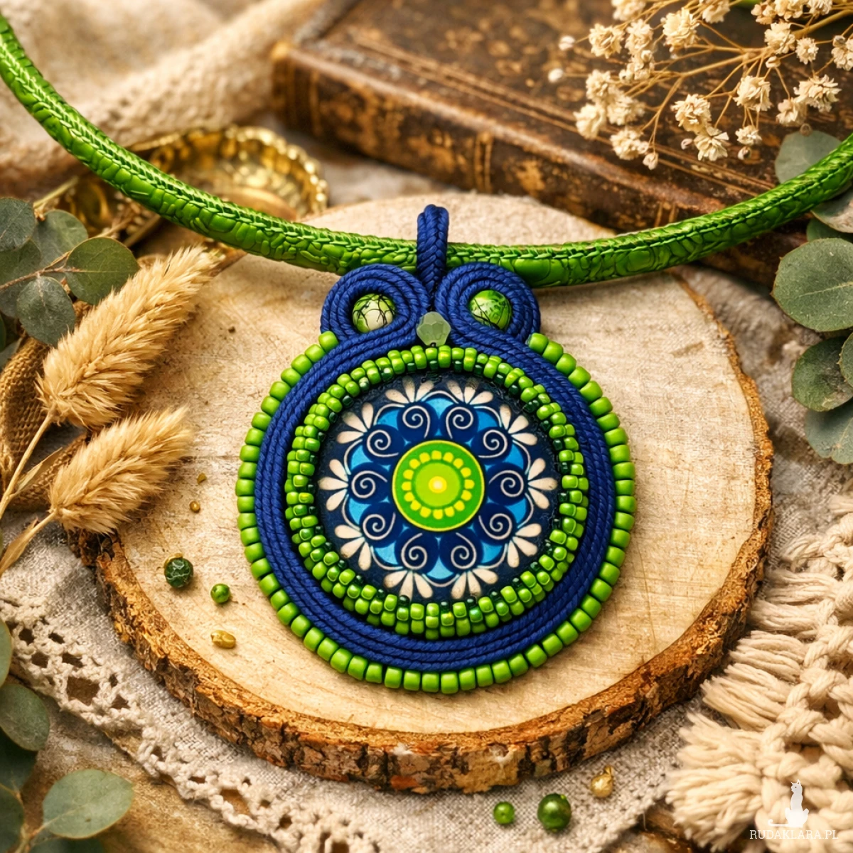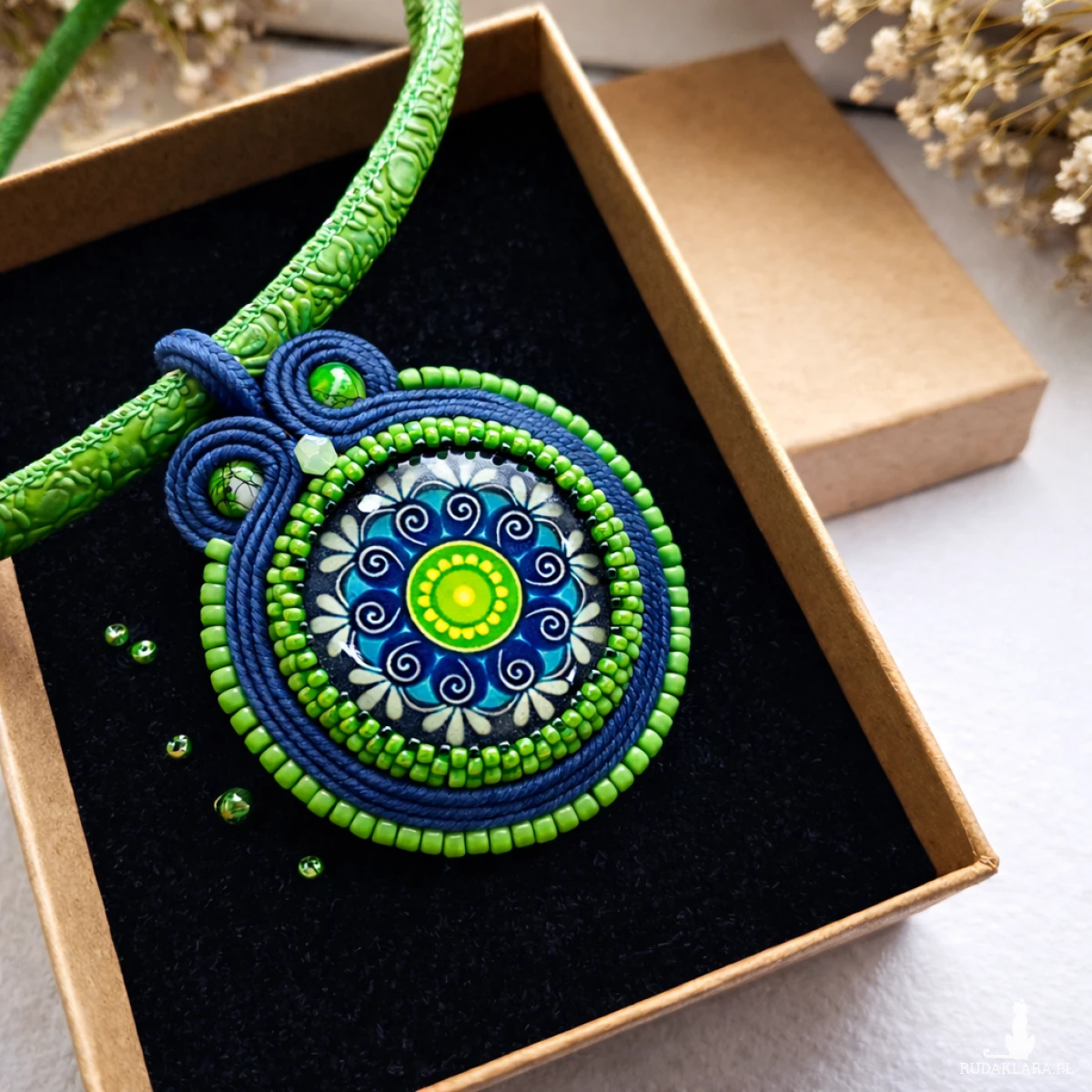 Unikatowy wisiorek sutasz stylizowany na kształt koła, wykonany pracochłonną techniką haftu soutache. Kompozycja w odcieniach głębokiego granatu i soczystej zieleni podkreśla dekoracyjny kaboszon z mandalowym wzorem, nadając całości artystyczny, boho charakter.