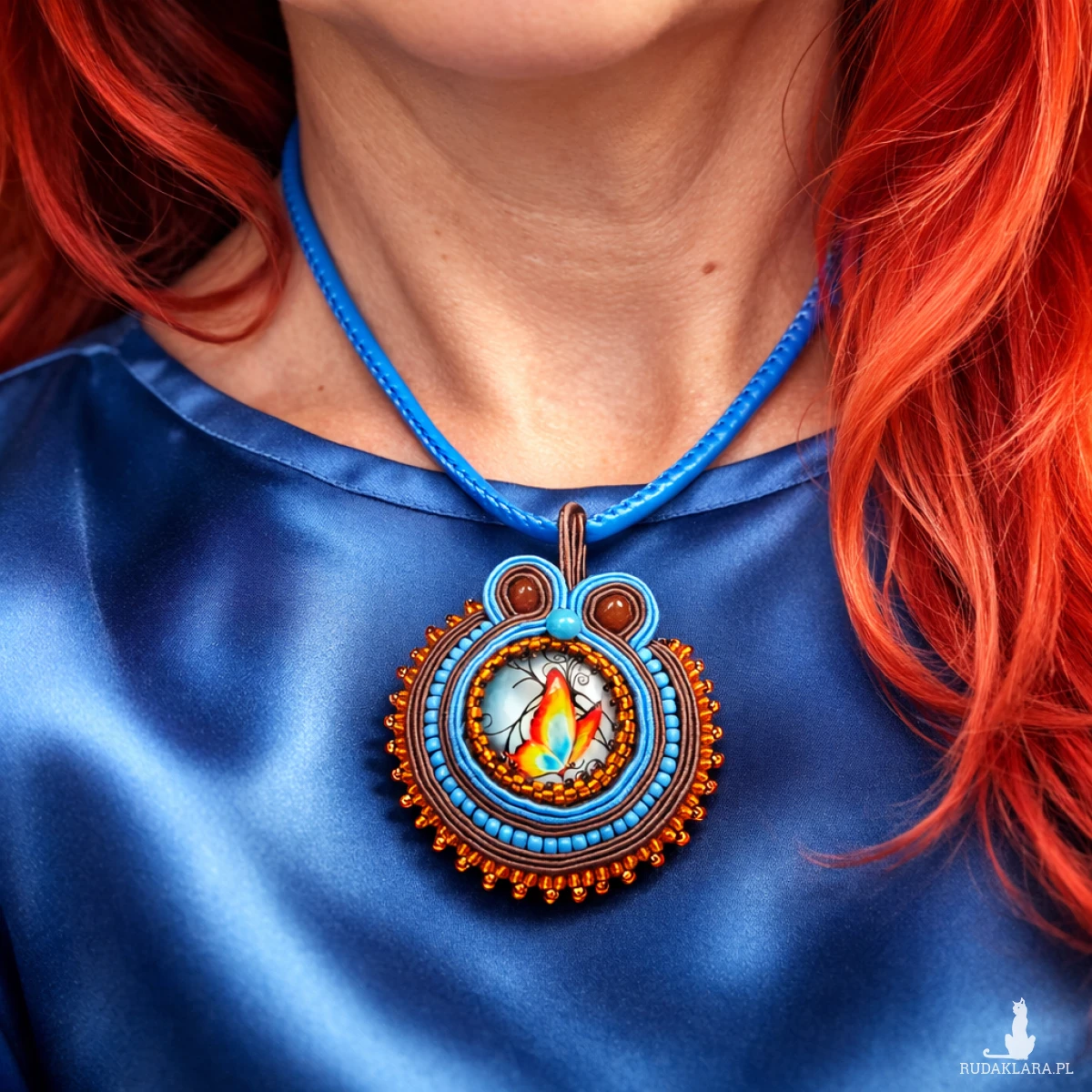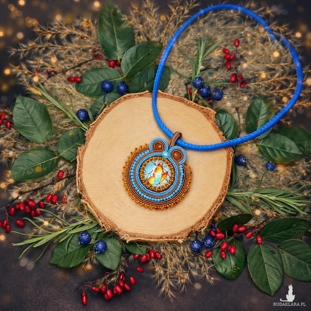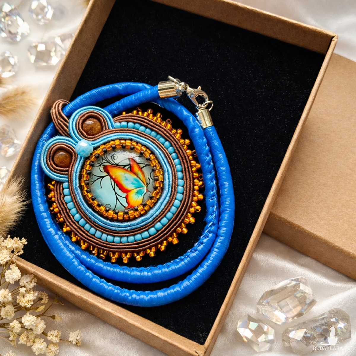Wyjątkowy wisiorek wykonany techniką haftu sutasz to połączenie precyzji rękodzieła i oryginalnego designu. Stylizowany na kształt koła naszyjnik w odcieniach turkusu, brązu i złota przyciąga uwagę subtelnym motywem motyla umieszczonym w centralnej części ozdoby.