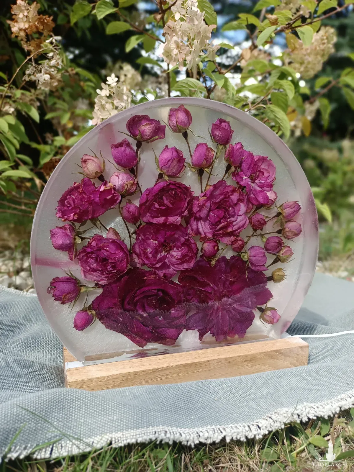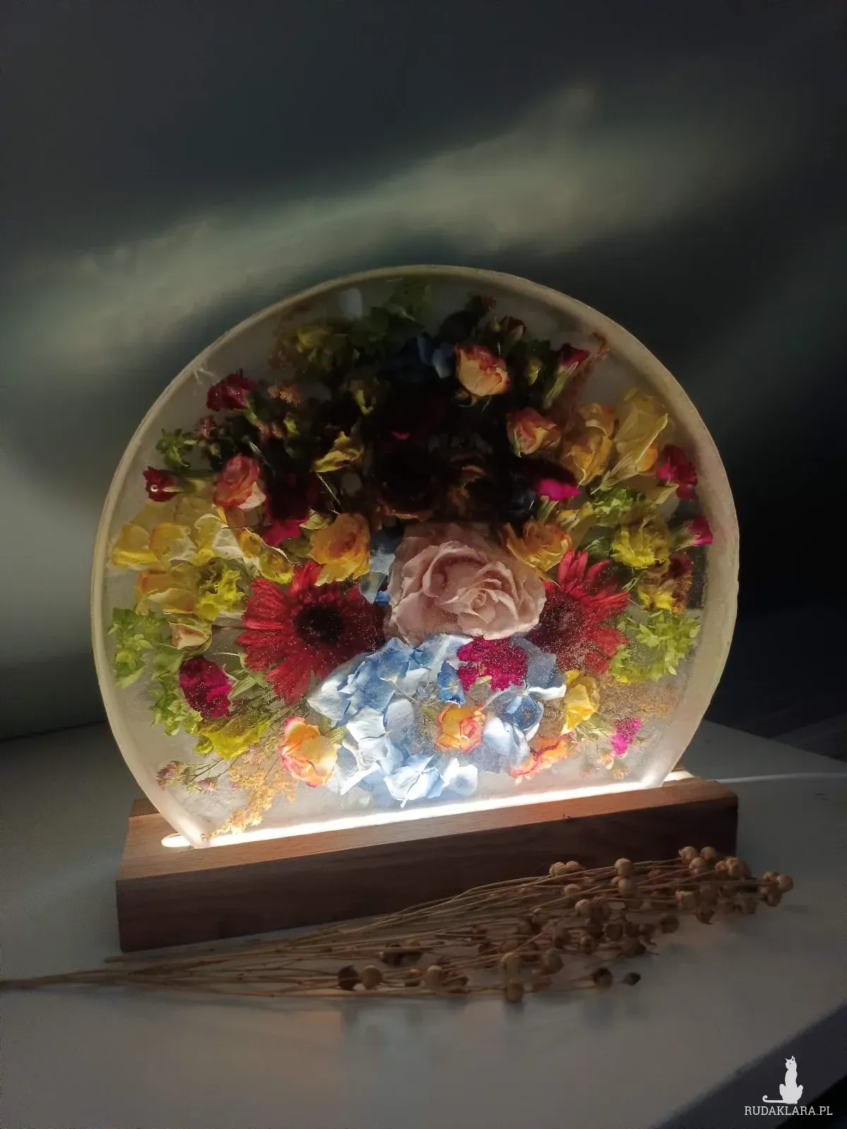 - Lampka w kształcie okręgu- wykonywana w głębokiej formie z kwiatów przestrzennych i drobnych na drewnianej podstawie z podświetleniem LED, zasilane kablem usb.