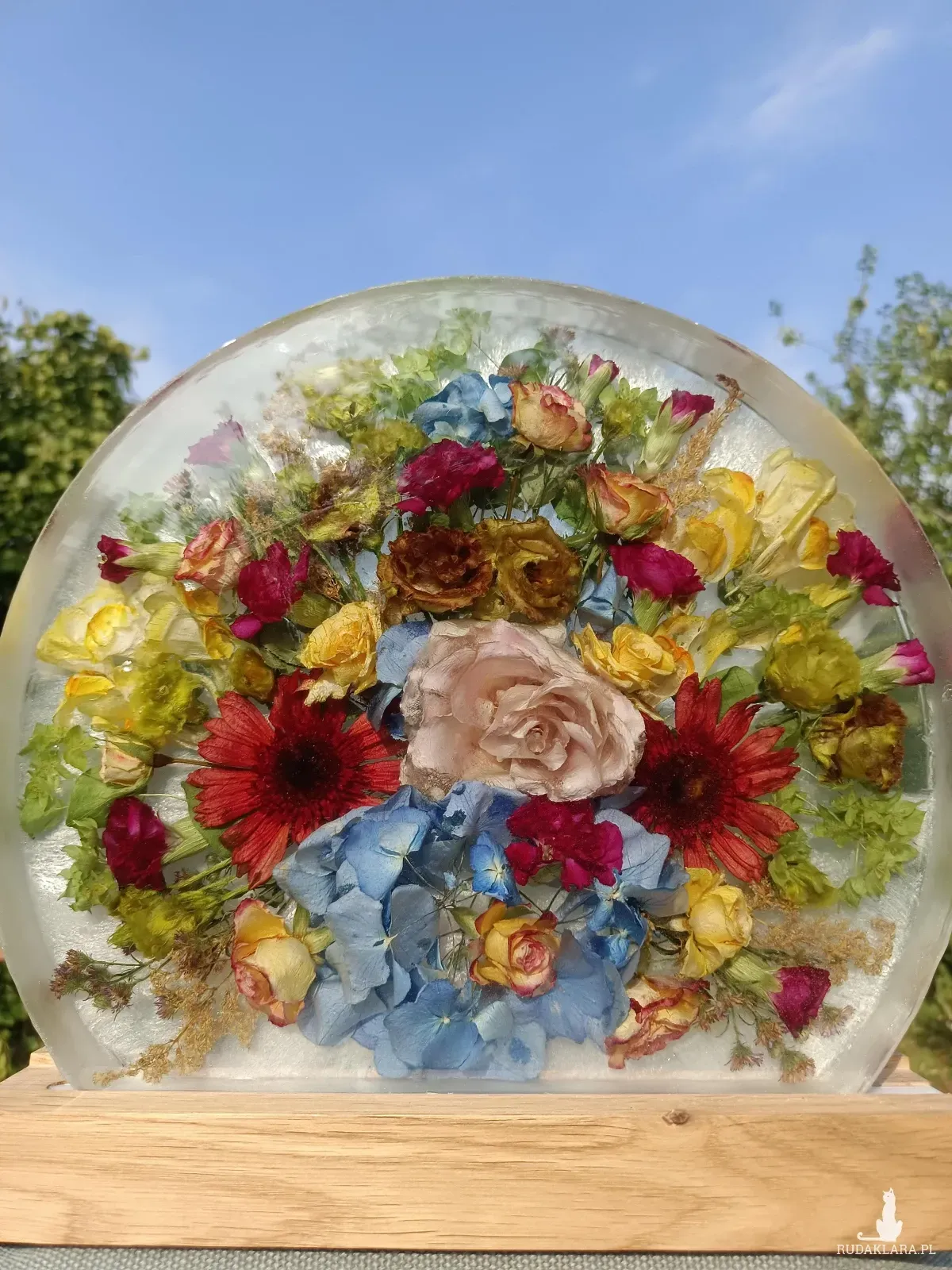 - Konserwacja bukietów w postaci pamiątek z autorskimi kompozycjami kwiatowymi utrwalonymi w żywicy.