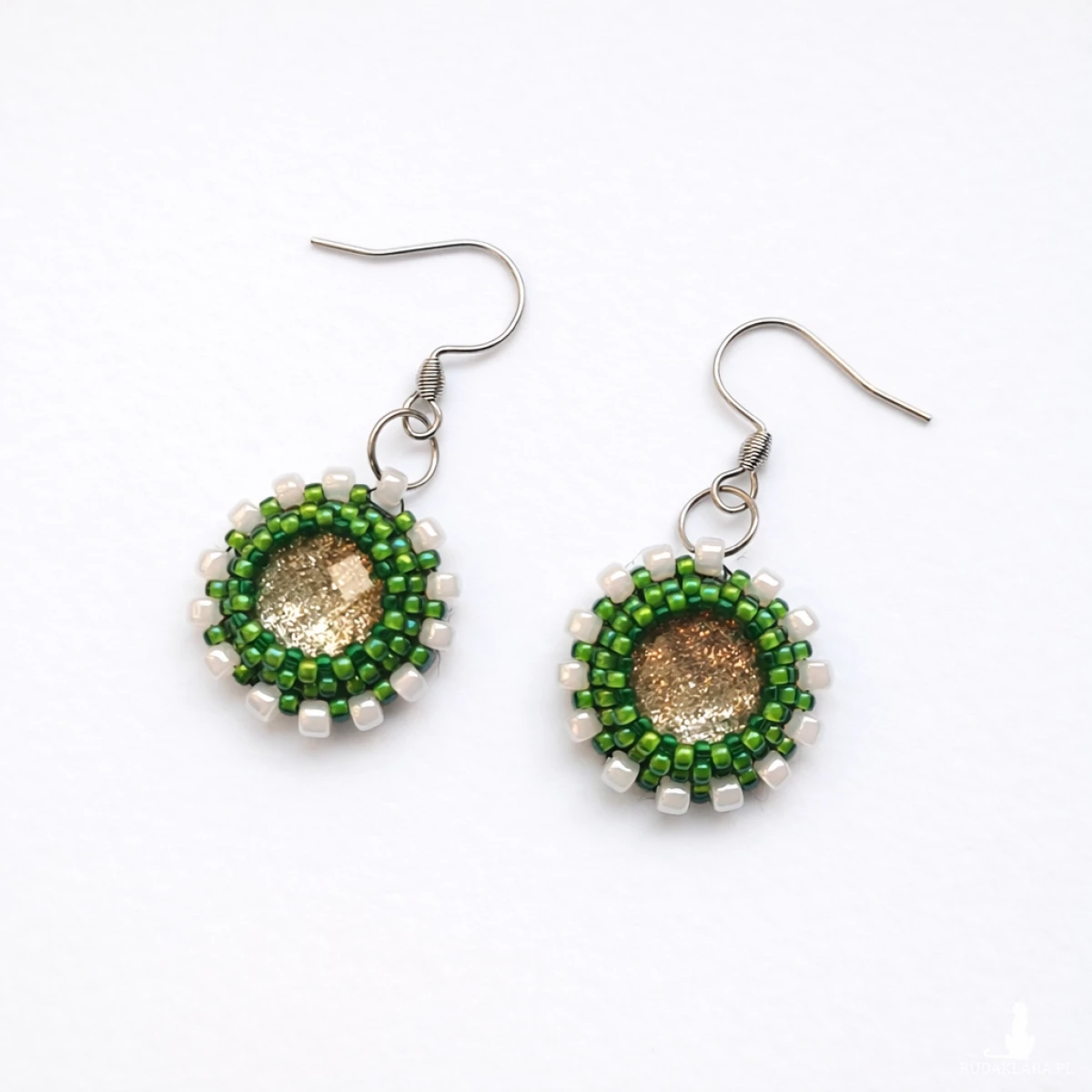 Całość wykonana techniką haftu koralikowego, gdzie każdy koralik jest starannie wyszyty, sprawia, że kolczyki nabierają wyjątkowej faktury i głębi. Błyszczące koraliki odbijają światło, dodając biżuterii elegancji i subtelnego blasku. Pomimo ich niewielkich rozmiarów, kolczyki mają wystarczająco dużo wyrazistości, by stać się wyróżniającym się elementem biżuterii, który z łatwością dopełni zarówno codzienne, jak i bardziej formalne stylizacje. To prawdziwie delikatna, ale przy tym efektowna biżuteria.