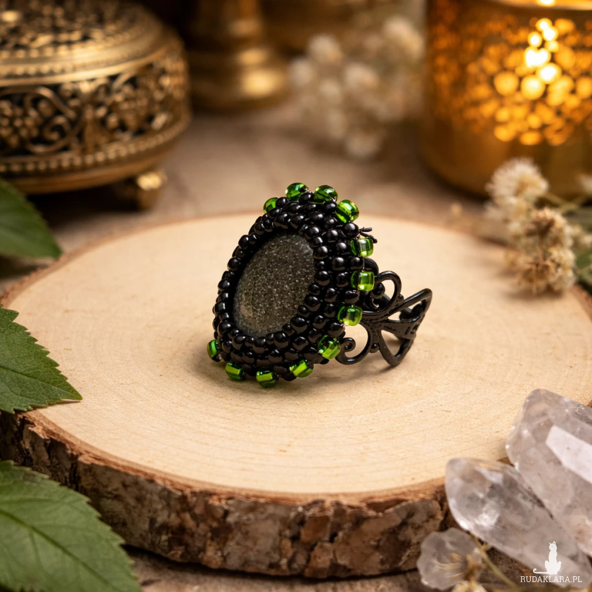 Wyjątkowy pierścionek handmade wykonany techniką haftu koralikowego. Centralnym punktem jest owalny, fasetowany kaboszon, który subtelnie odbija światło i nadaje biżuterii eleganckiego charakteru.