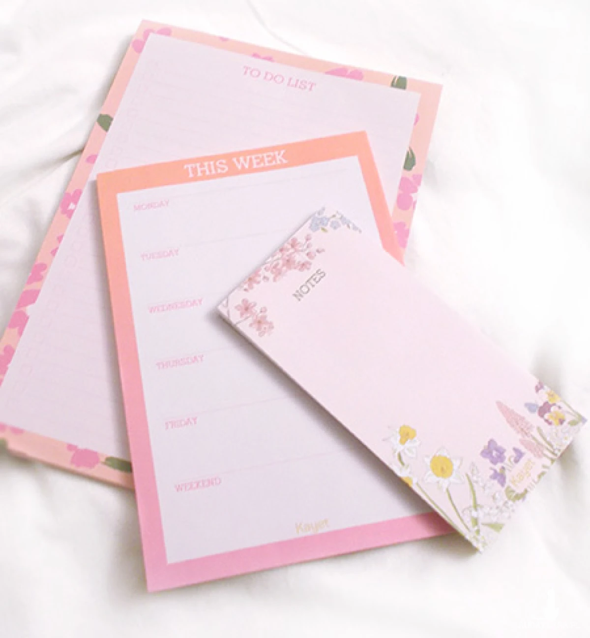 Zestaw 3 notesików w pastelowych kolorach. Notes "To do list (lista rzeczy do zrobienia), notes "This week" (w tym tygodniu) i notesik w kwiatki, marka "Kayet".