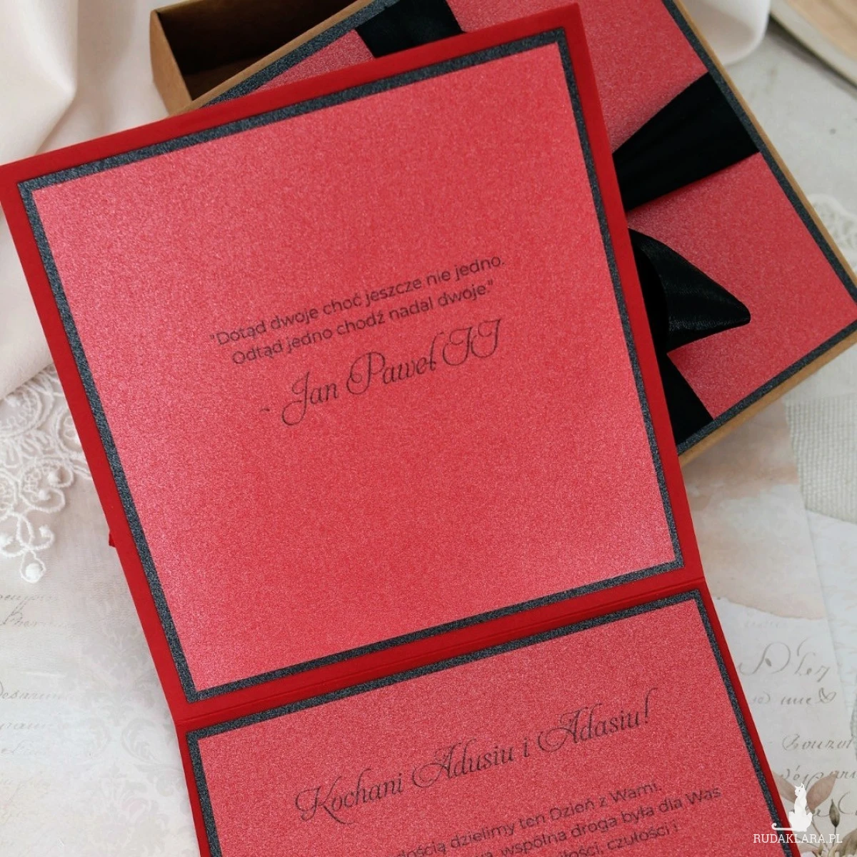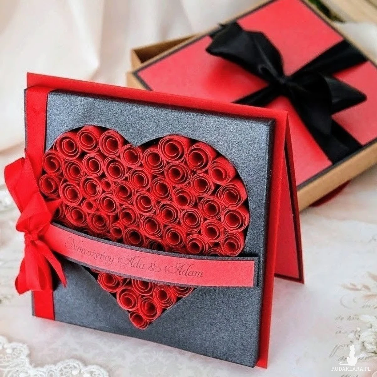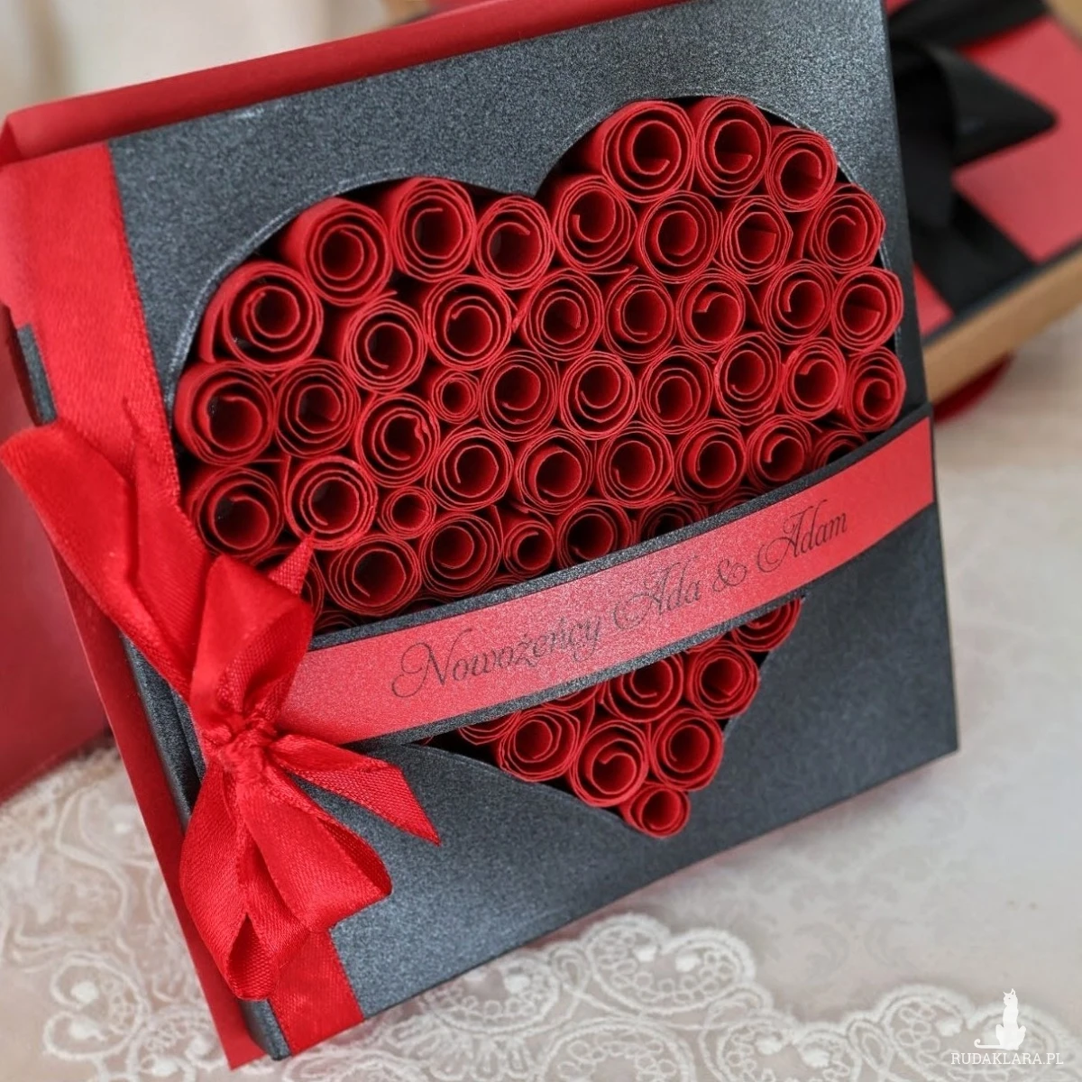 Intensywna czerwień połączona z elegancką czernią tworzy wyrazistą, a jednocześnie stylową kompozycję. Na przodzie kartki znajduje się serce wykonane z ręcznie zwijanych ruloników papieru oraz imiona - detal, który przyciąga uwagę i nadaje całości wyjątkowy charakter.