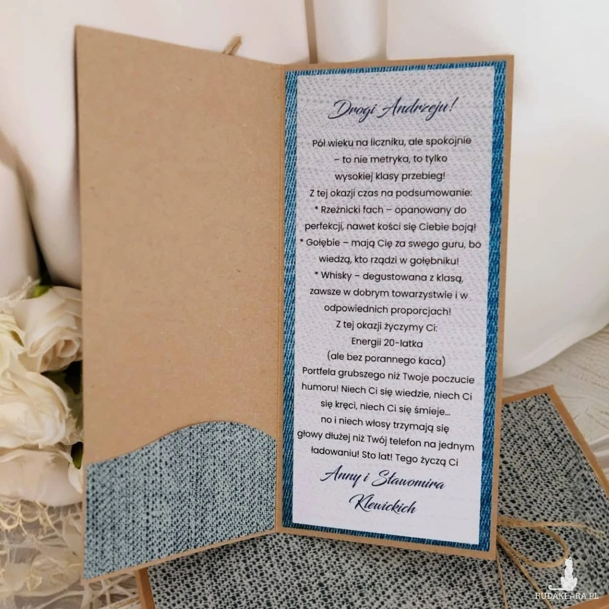 W środku znajdują się życzenia - możesz wybrać tekst taki jak na zdjęciu lub dodać własny. Istnieje możliwość dodania kieszonki na pieniądze lub voucher.