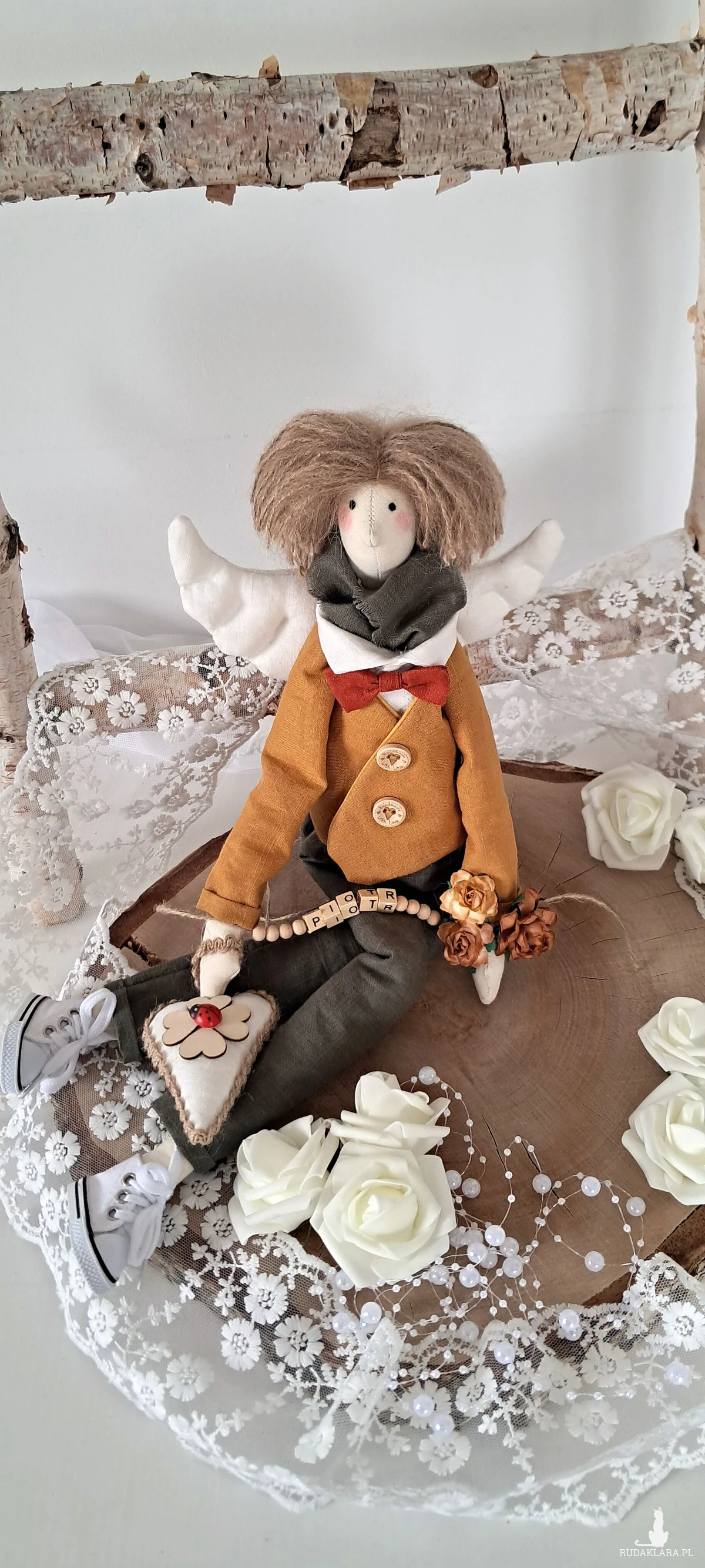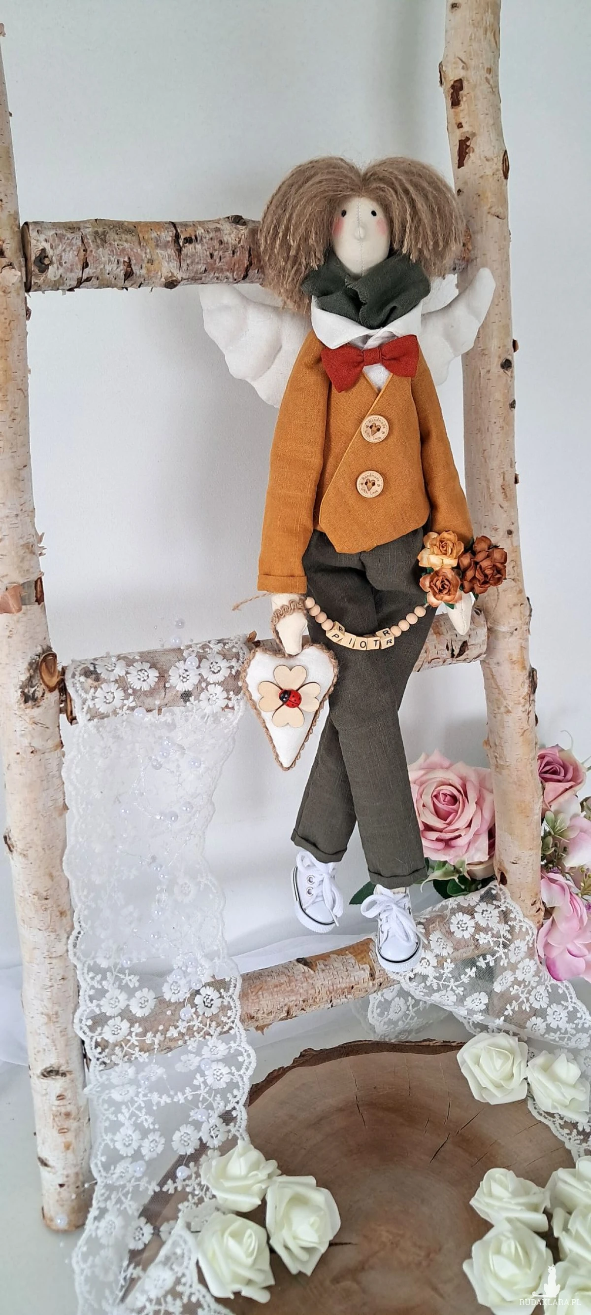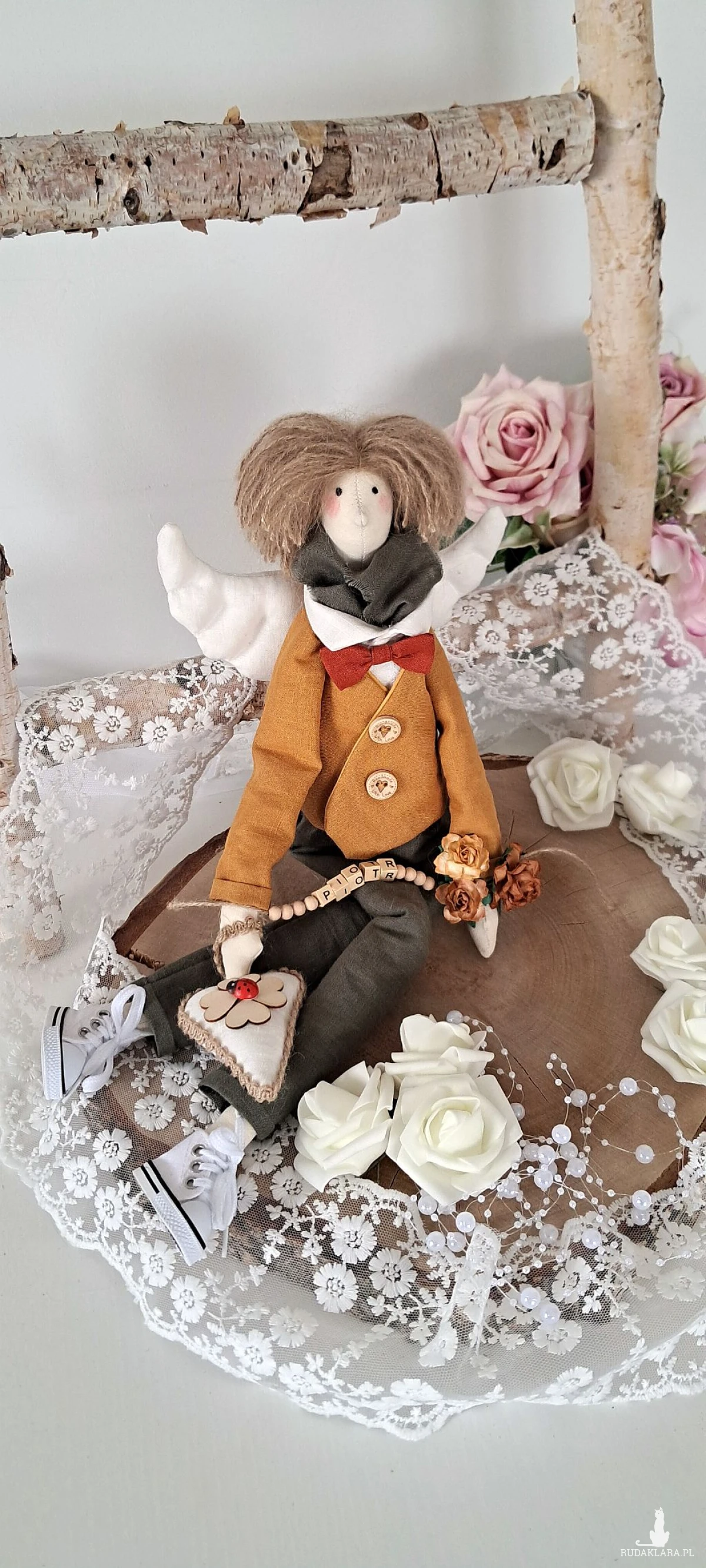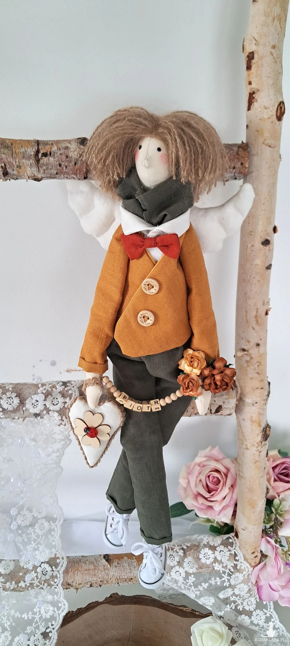 Witam serdecznie. Mam do sprzedania anioła chłopca. Ubranko z wysokogatunkowego lnu: biała koszula, marynarka koloru musztardy, spodnie ciemna zieleń. Pod szyją apaszka i muszka. Guziki drewniane. Skrzydła i serduszko również uszyte z lnu. Serduszko udekorowane koniczynką czterolistną i biedroneczką. Na stópkach białe trampki. Włosy z wełny koloru brązowego. Imię koralikowe zmienię stosownie do potrzeby (proszę o wiadomość w tym zakresie)Wysokość 47 cm. Może siedzieć lub być zawieszony.