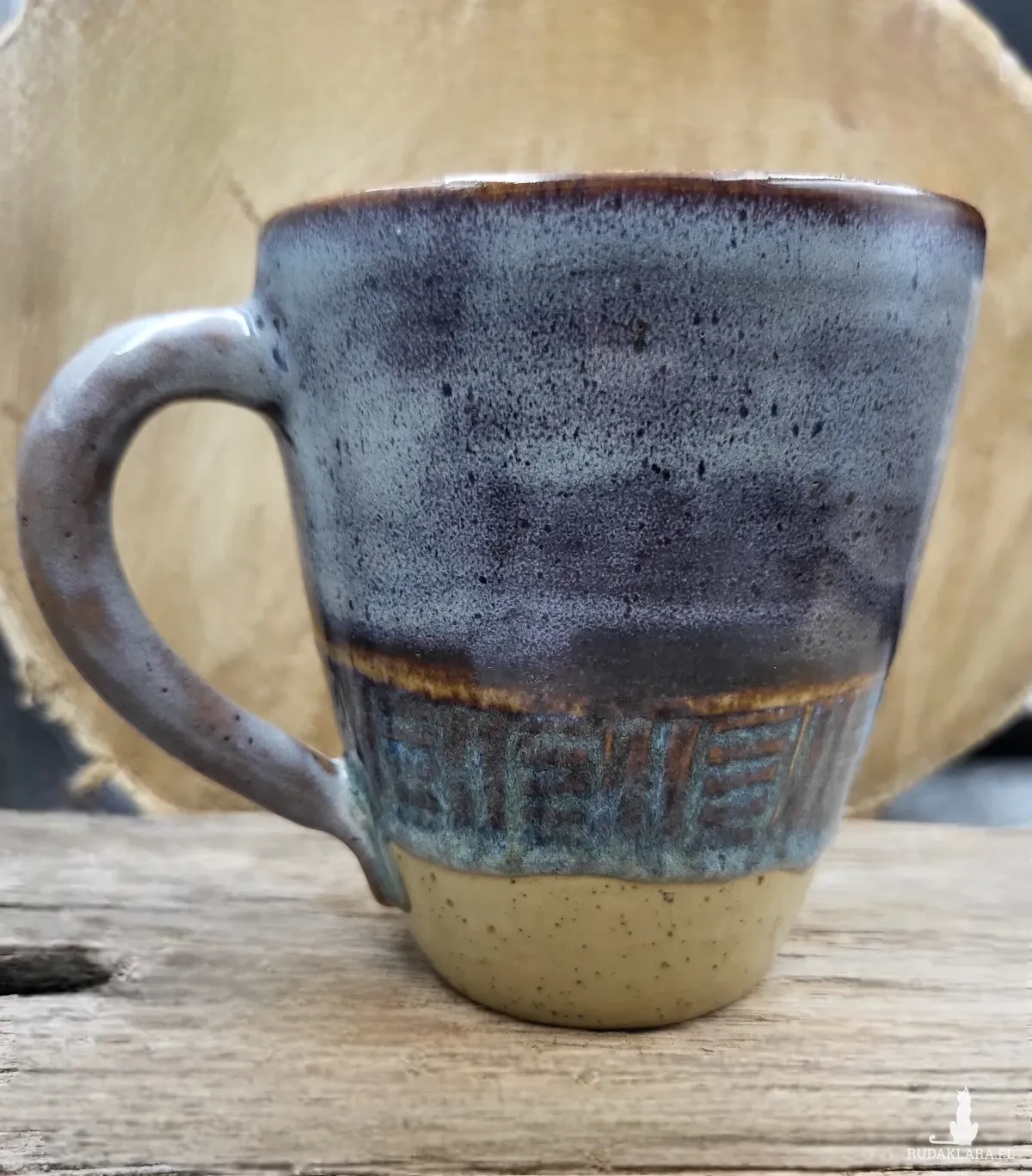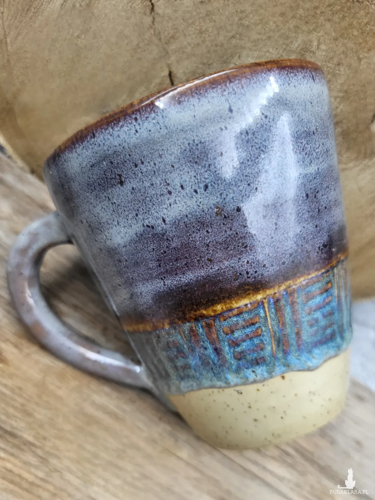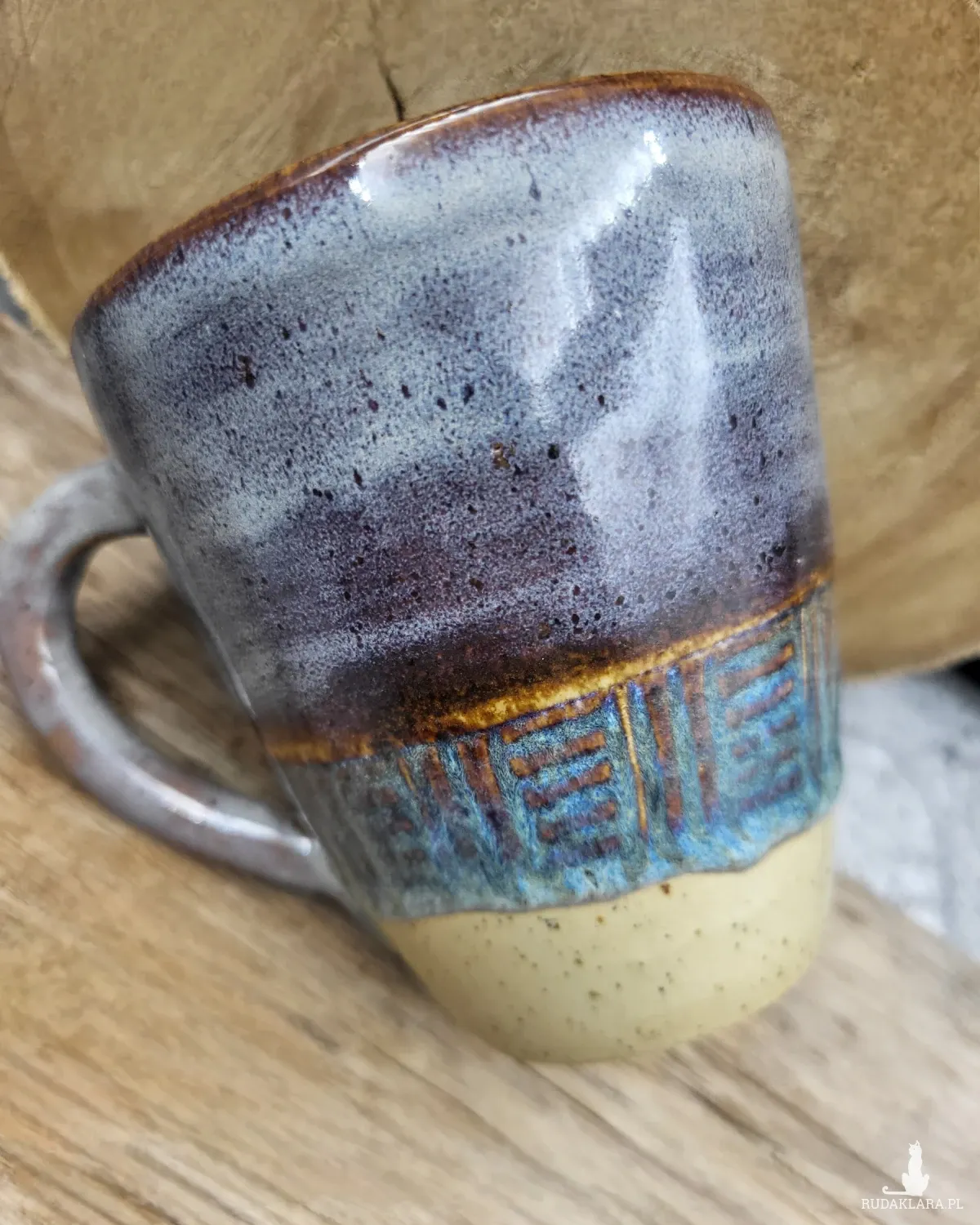 Toczony, rwcznie dekorowany ceramiczny kubek o pojemności 350 ml i wymiarach: