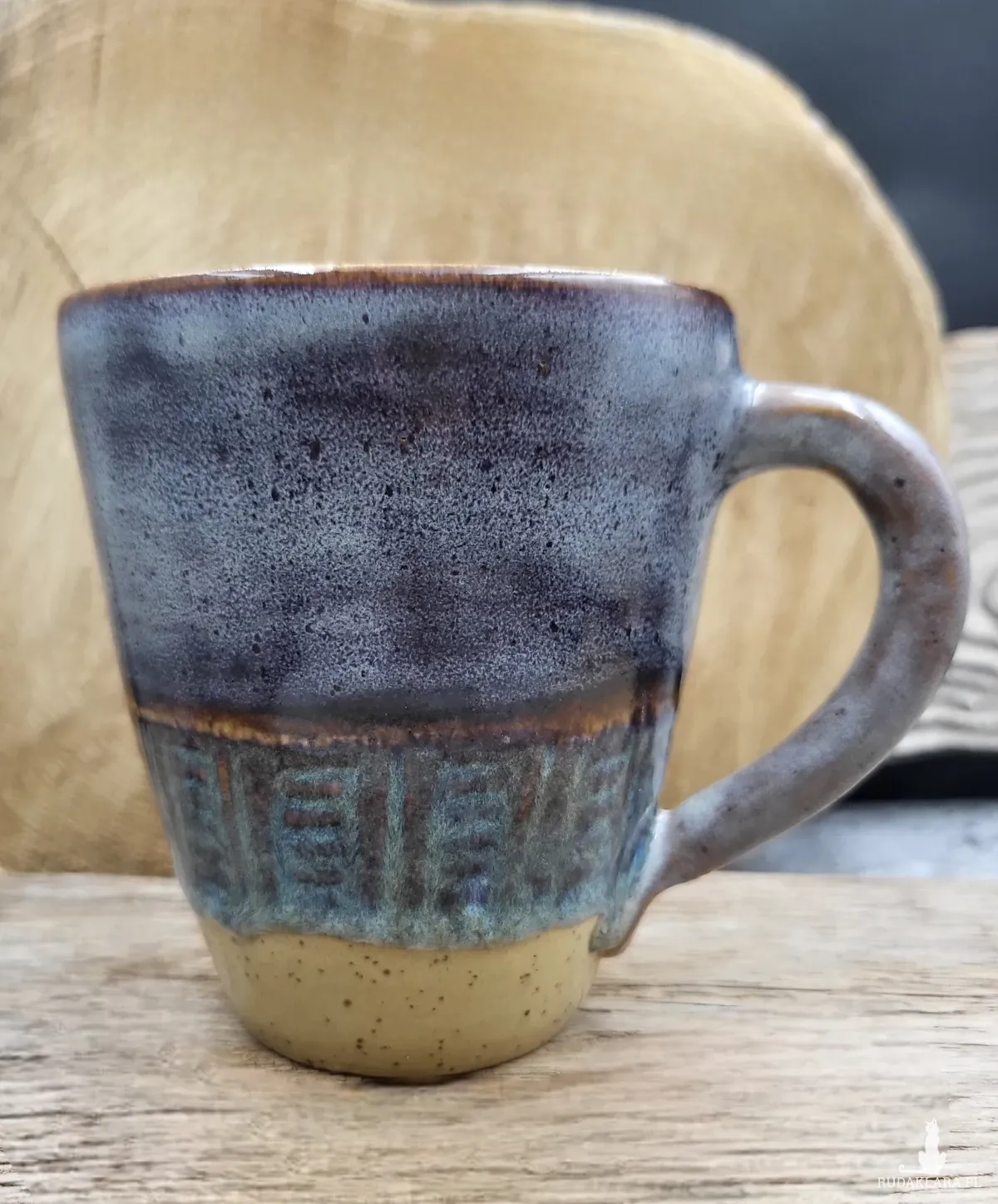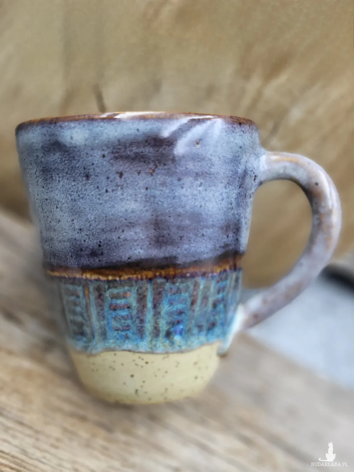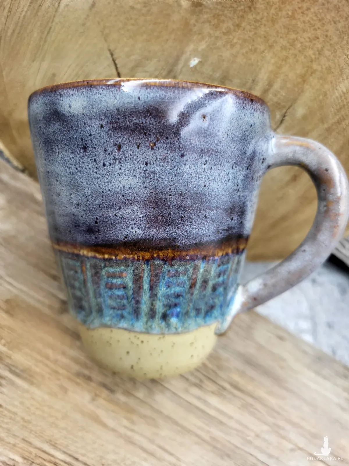 Toczony, rwcznie dekorowany ceramiczny kubek o pojemności 350 ml i wymiarach: