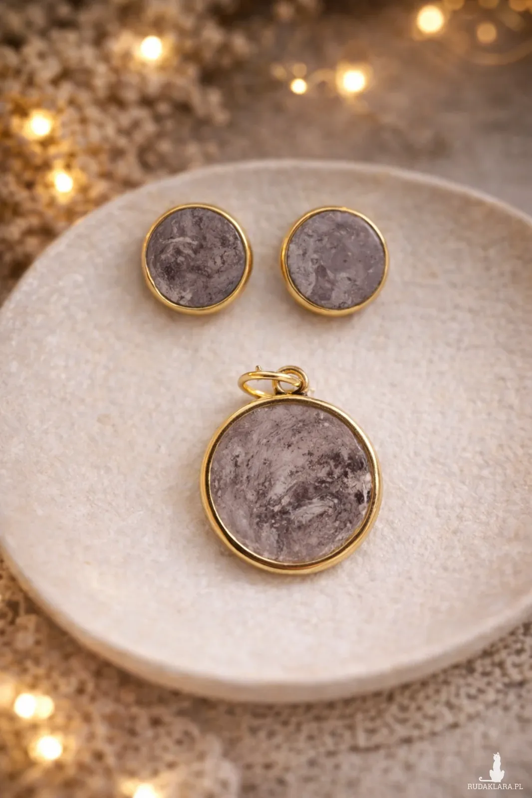 Komplet biżuterii został wykonany z gliny samoutwardzalnej, zabezpieczony lakierem z połyskiem. Sztyfty i zawieszka antyalergiczne , bez kadmu i ołowiu.