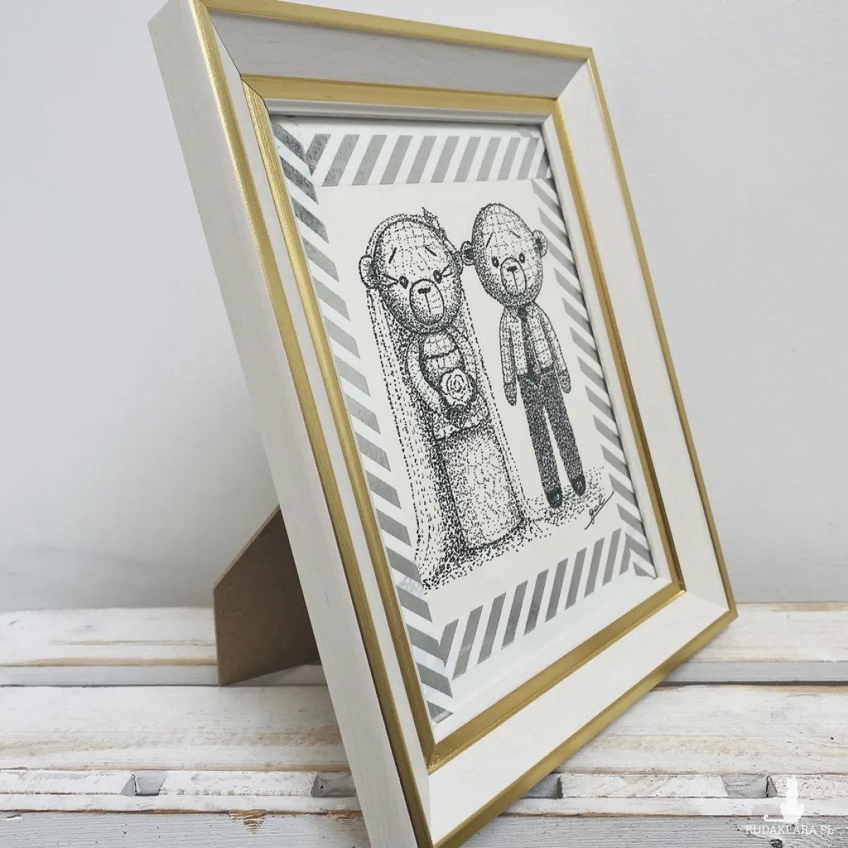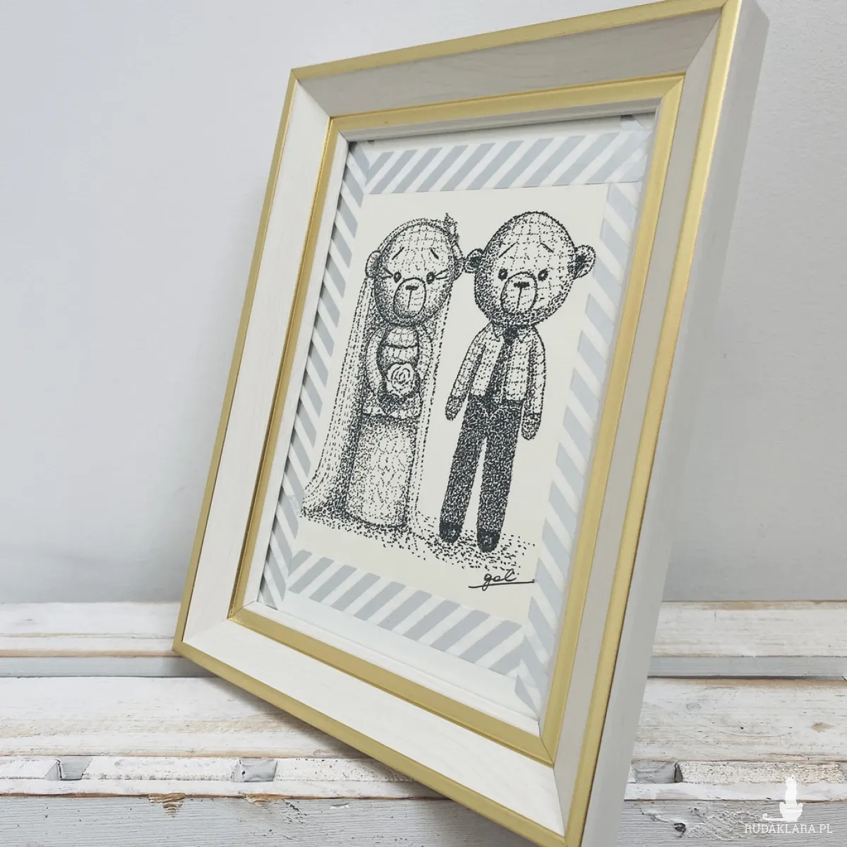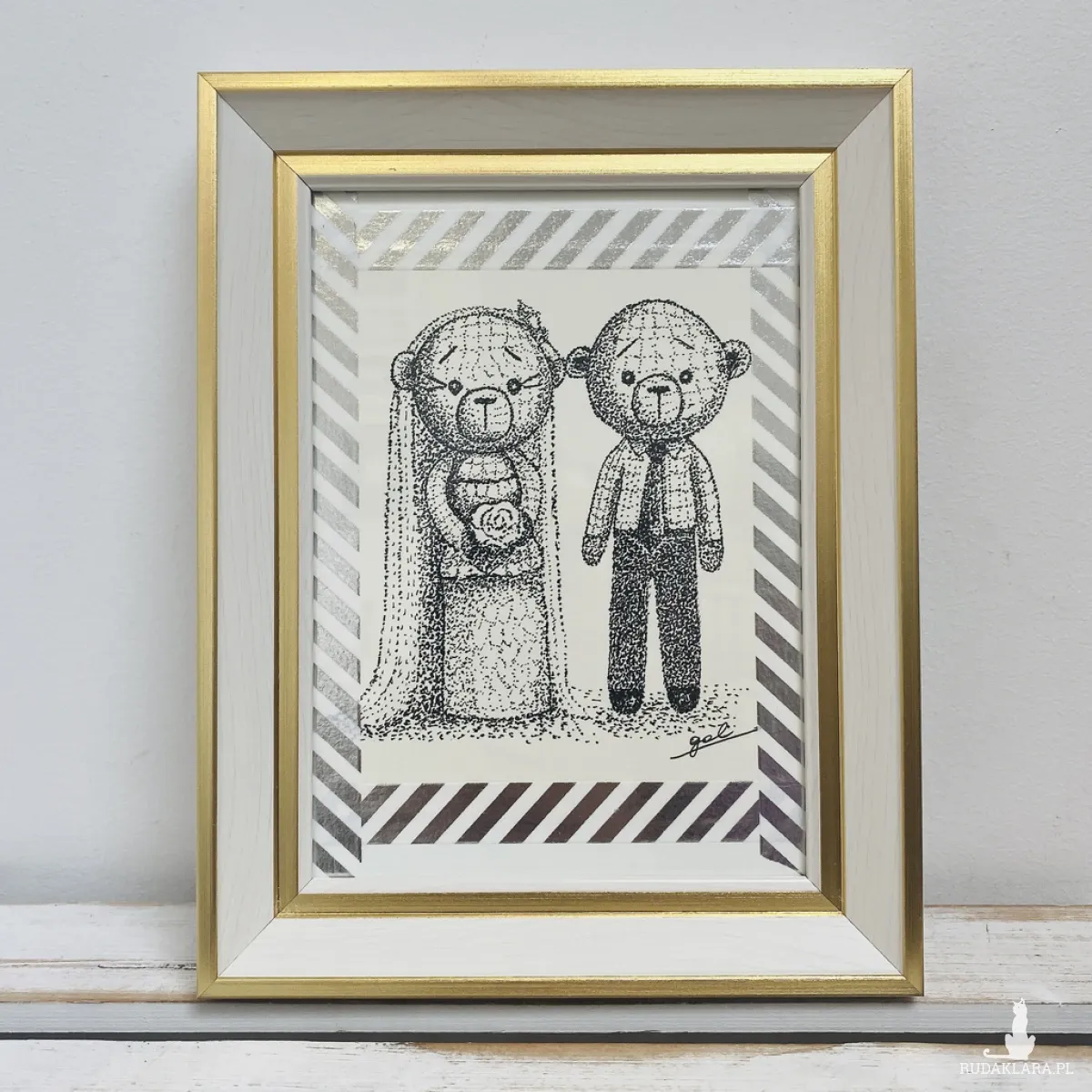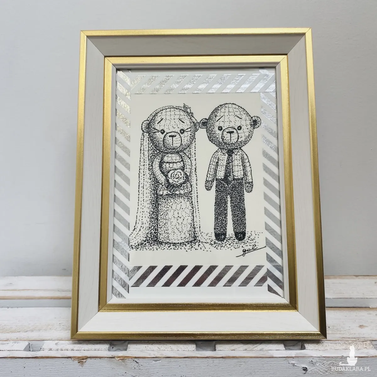 Młoda para misie w ramce rysowane piórkiem prezent ślubny obraz