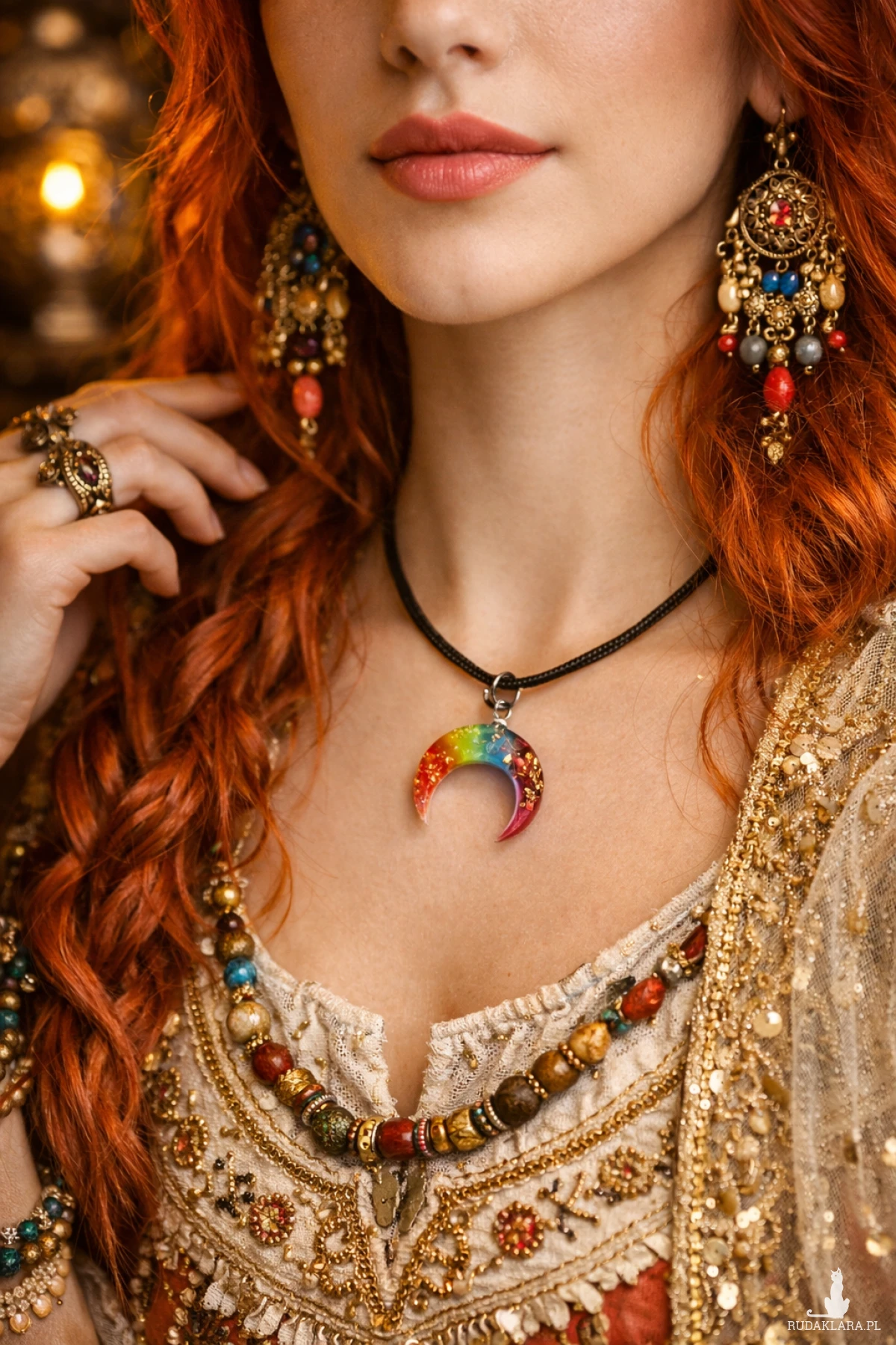Lunula od wieków była noszona jako talizman przynoszący spokój, płodność i opiekę księżycowej energii. W tej artystycznej formie łączy tradycję słowiańską z nowoczesnym stylem boho.
