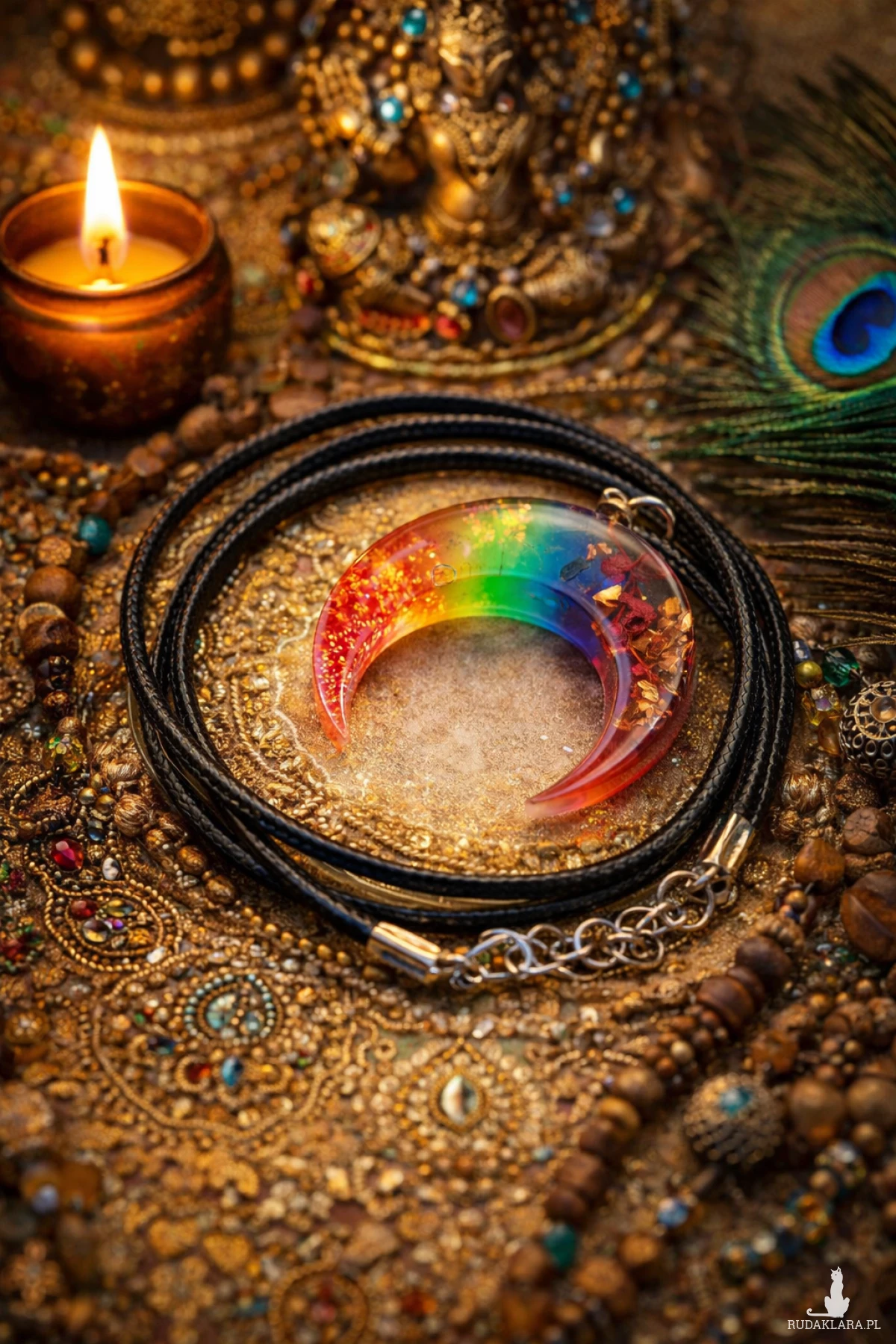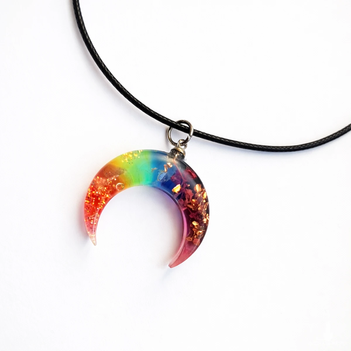 Ręcznie wykonany wisiorek lunula orgonit to współczesna interpretacja dawnego słowiańskiego amuletu ochronnego. Transparentna żywica w barwach siedmiu czakr tworzy energetyczną kompozycję z naturalnymi minerałami i roślinami.