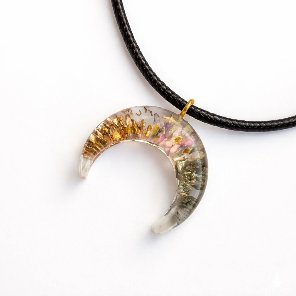 Lunula to jeden z najbardziej rozpoznawalnych symboli kobiecej energii w kulturze słowiańskiej. Ten ręcznie wykonany wisiorek w formie orgonitu łączy tradycyjną symbolikę z nowoczesnym designem. Transparentna żywica eksponuje zatopione wewnątrz elementy – bizmut, miedź, kryształ górski oraz delikatne niezapominajki.