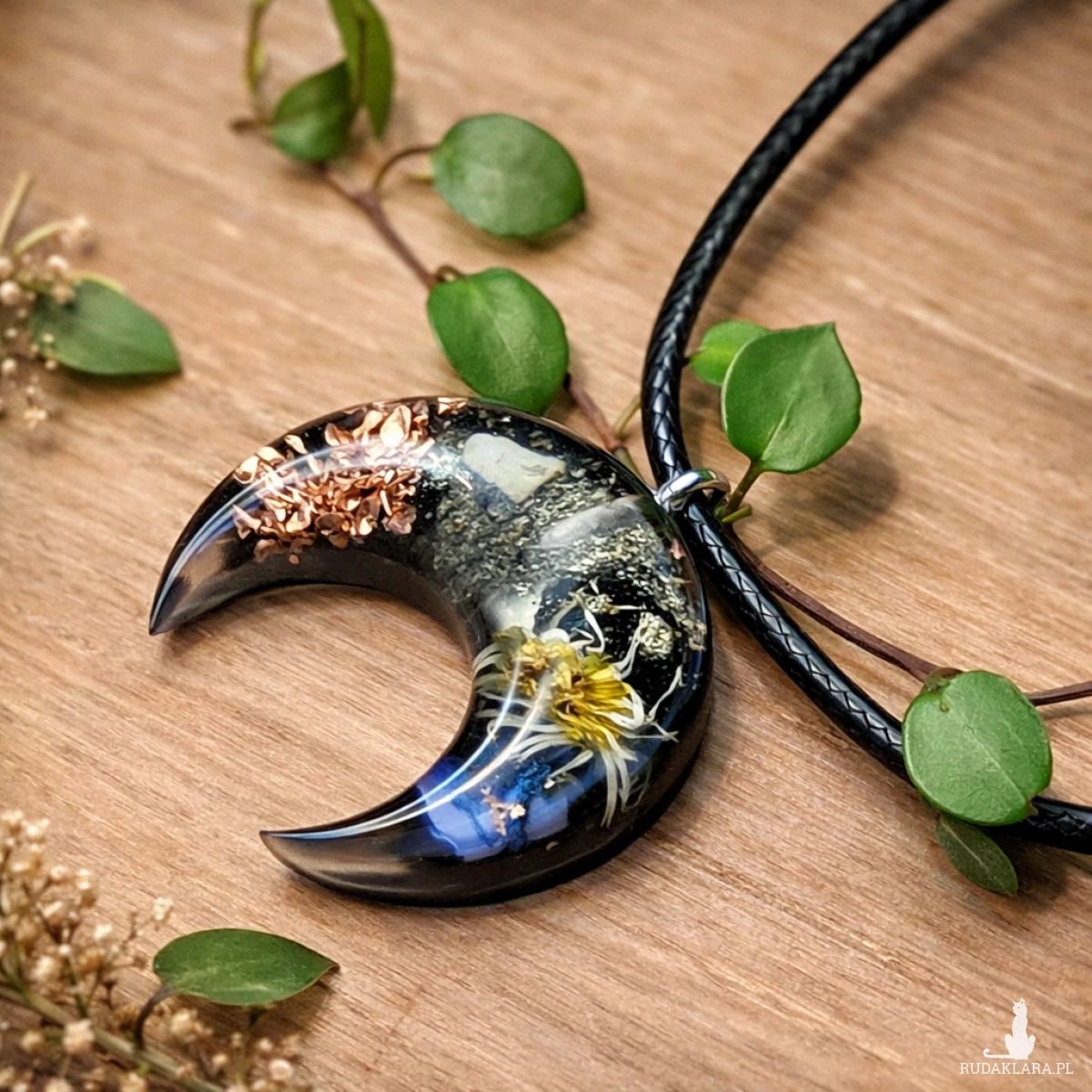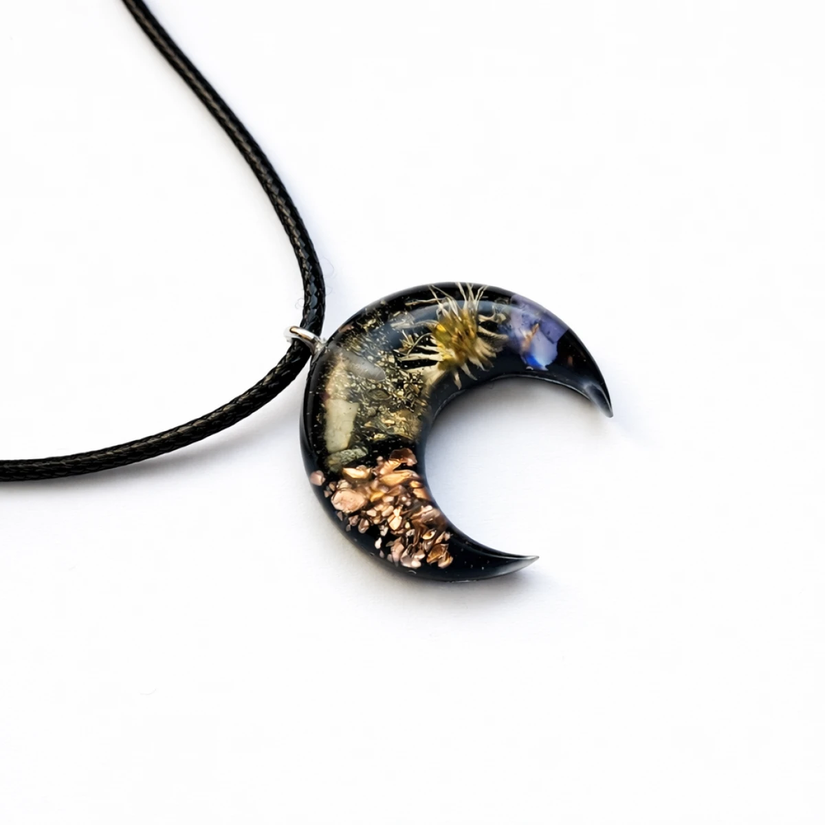 Ręcznie wykonany wisiorek lunula z orgonitu to współczesna interpretacja dawnego słowiańskiego amuletu. Głębokie czarne tło podkreśla naturalne elementy zatopione w krystalicznej żywicy – bizmut, miedź, kryształ górski oraz subtelne kwiaty.