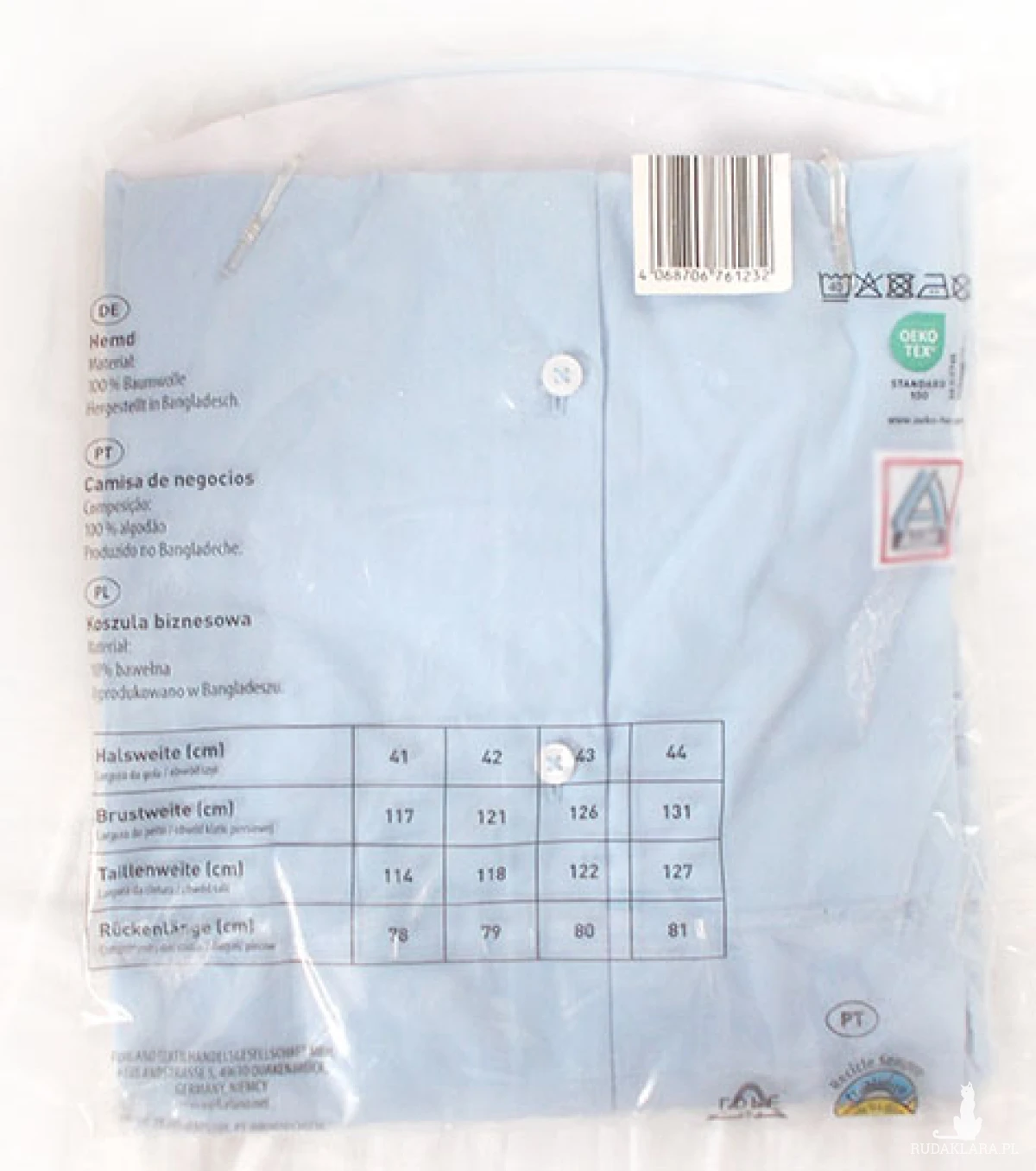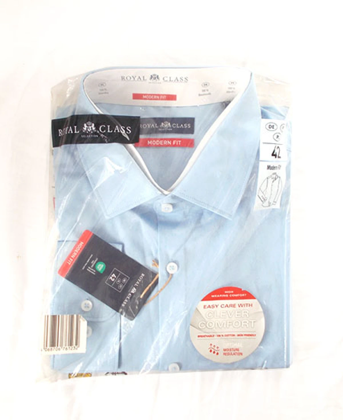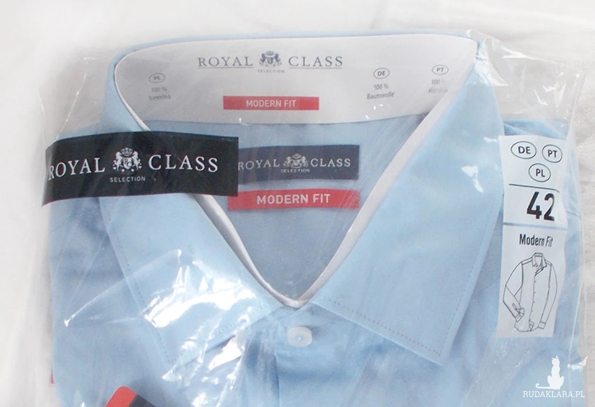Nowa koszula męska 42, "Royal Class -modern fit", materiał: 100% bawełna, kolor niebieski długi rękaw, zapinana na guziki. Tkanina standard "Oeko Tex 100". Wymiary: obwód szyi 42 cm, obwód klatki piersiowej 121 cm, obwód talii 118 cm, długość pleców 79 cm.