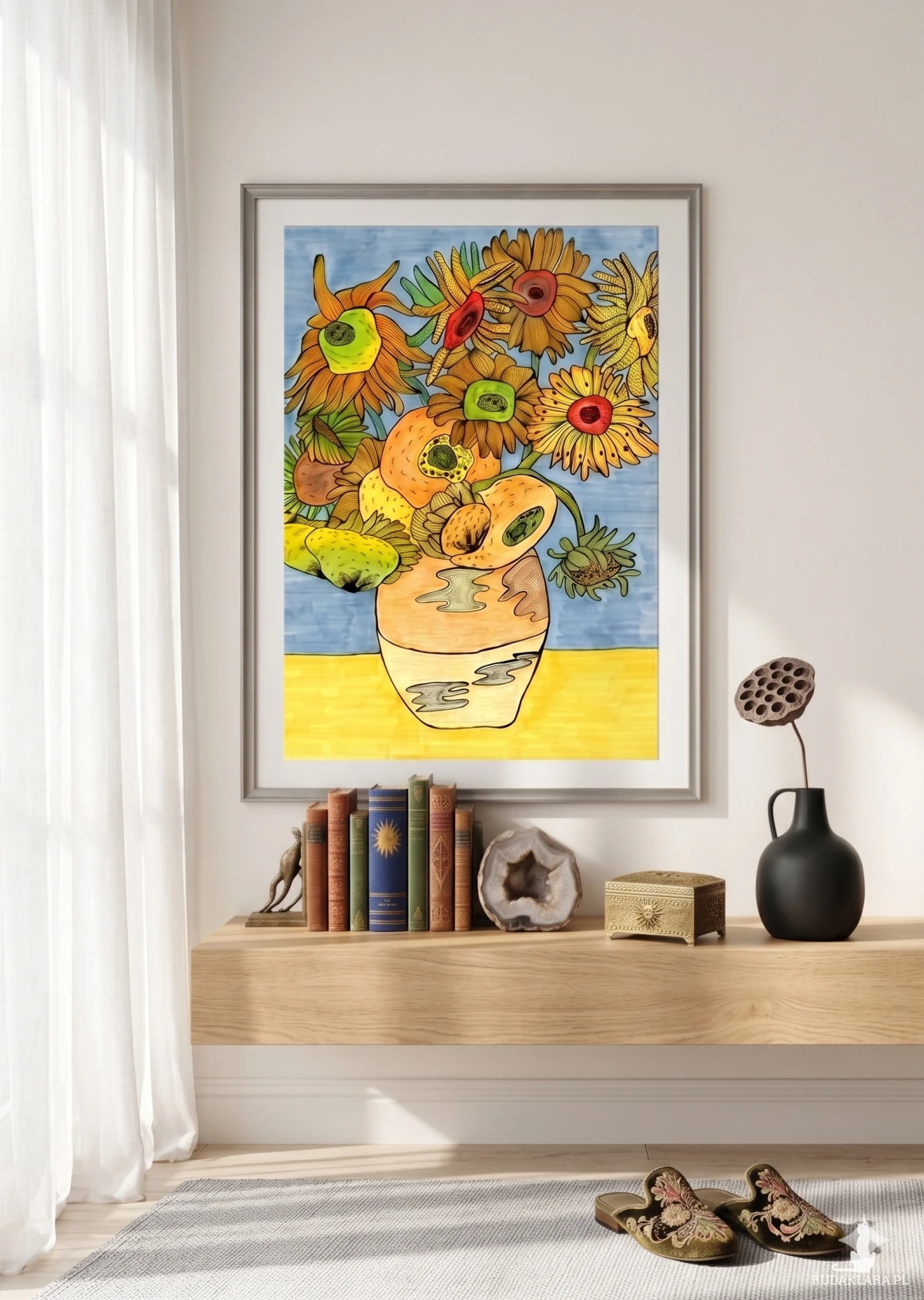Intensywne odcienie żółtego i pomarańczowego dominują w kwiatach, które są dynamiczne i lekko zdeformowane. Odróżnia je jednak precyzyjne wypełnienie detalami (wzory geometryczne i organiczne) w centrach kwiatów i na wazonie. Tło jest proste — niebieska ściana i żółty stół — co podkreśla kontrast między ekspresją a medytacyjnym detalem.