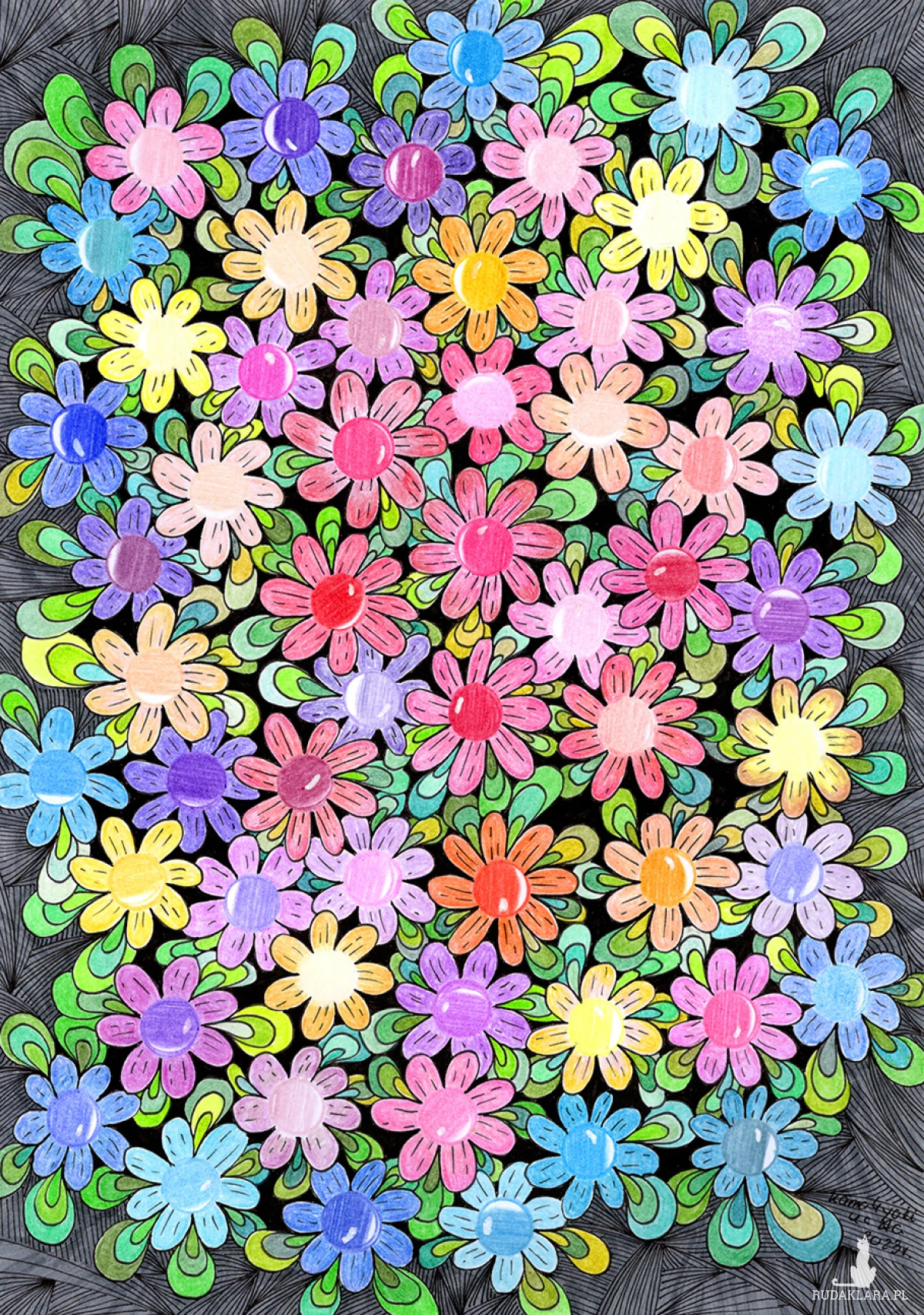 Intensywna, dekoracyjna ilustracja przedstawiająca gęsty, niekończący się dywan stylizowanych kwiatów w pełnym rozkwicie. Kompozycja charakteryzuje się paletą soczystych, cukierkowych kolorów (róże, błękity, fiolety, żółcie), które kontrastują z mrocznym, chaotycznym tłem z gęstych, czarnych linii. Kwiaty mają uproszczoną formę, ale są nasycone jasnymi akcentami, tworząc wrażenie wibrującej, niemal psychodelicznej obfitości.