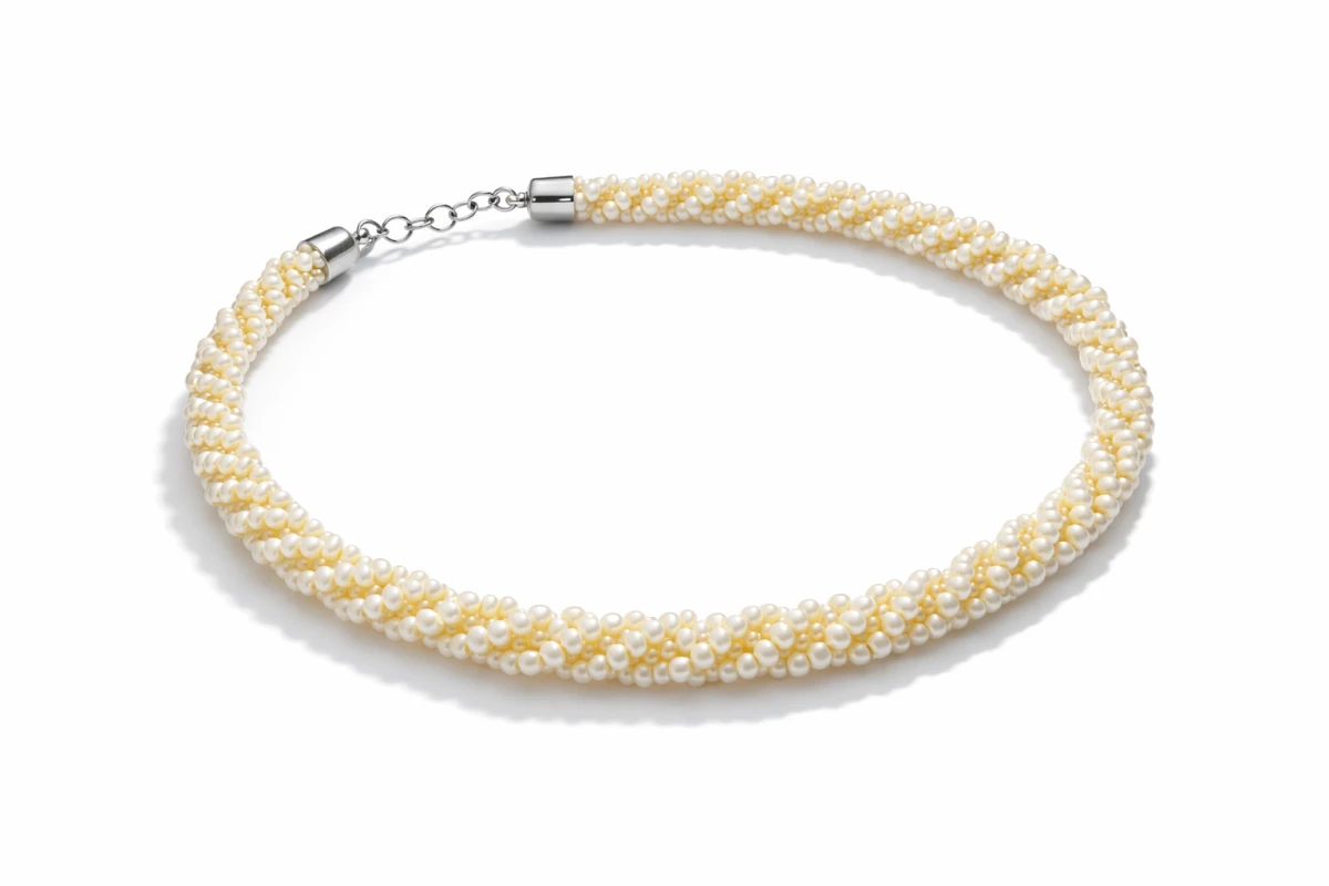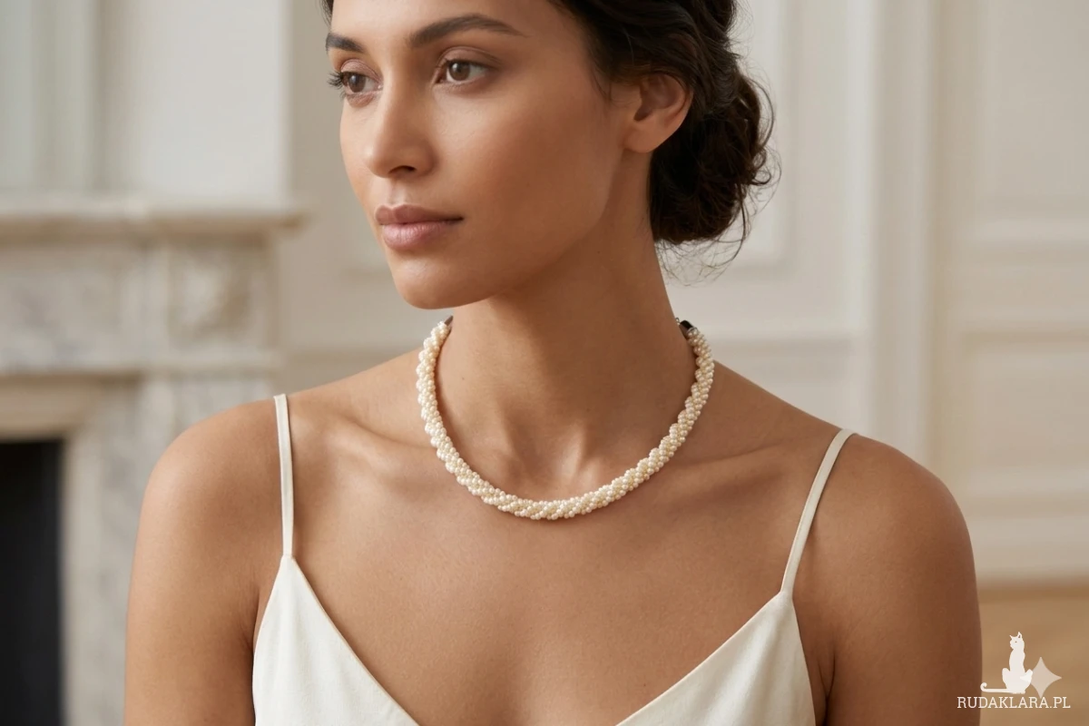 wykonanemu z setek drobnych, kremowych pereł. Jego unikalna, pleciona struktura w formie grubszego sznura
