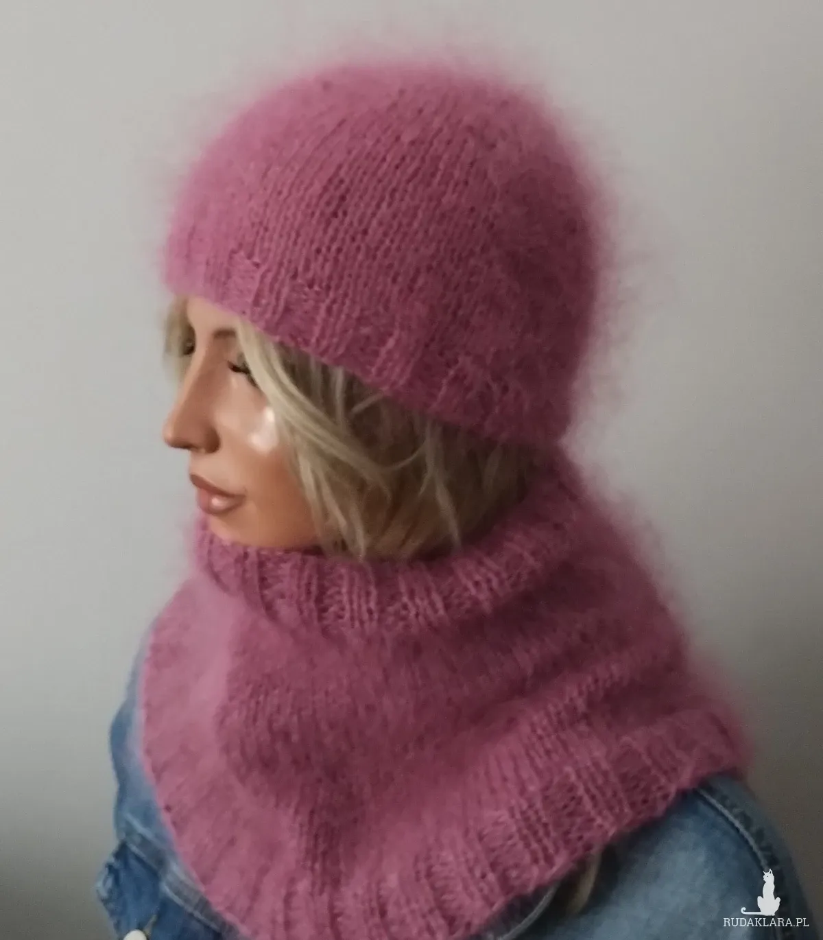 Komplet czapka i komin zrobione ręcznie na drutach z mieszanki 50%akrylu i 50%moheru w kolorze ciemnego różu-ciemnej fuksji.Miękka,nie gryzie.