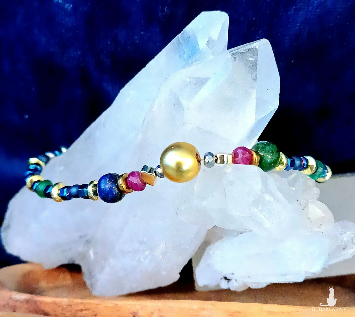 Piękny azuryt - intuicja, jadeit - szczęście , złoty i kolorowy hematyt- odwaga, agat - równowaga : to mocne połączenie cudownych kamieni w tej bransoletce - do tego jest bardzo elegancka !