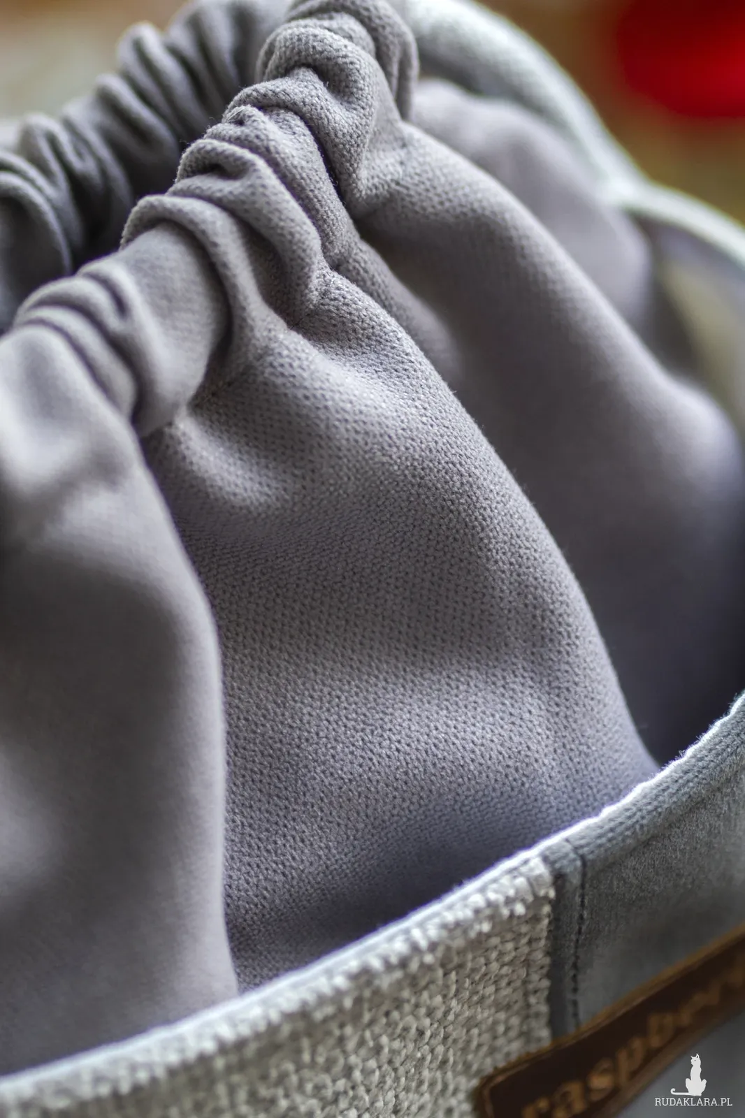 Całość ściągana grubym, bawełnianym sznurkiem w kolorze jasnoszarym.