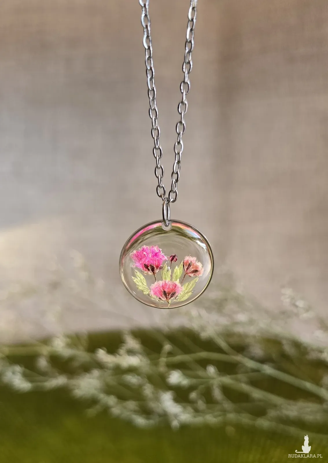 Oferuję Państwu unikalną biżuterię. Zawieszka jest wykonana z suszonych kwiatów i żywicy epoksydowej. Biżuteria jest wspaniałym i oryginalnym prezentem na lata.