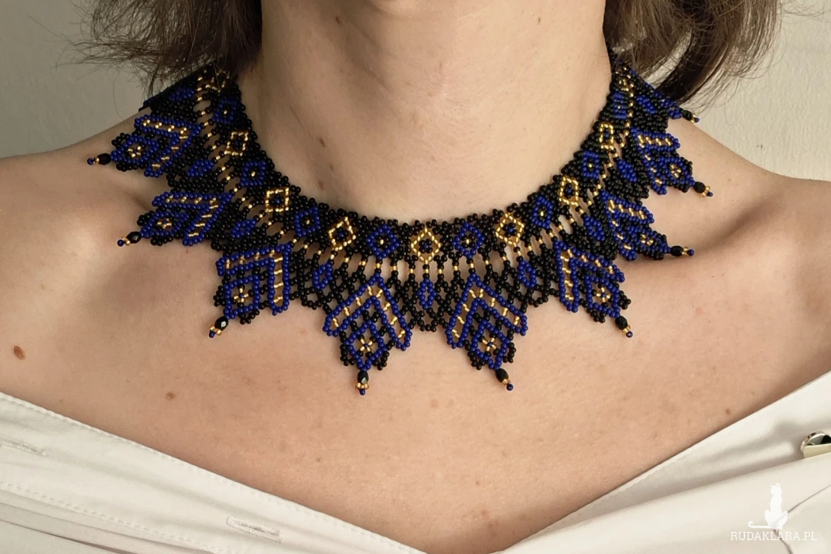 Połączenie klasycznej czerni z królewskim błękitem i złotymi koralikami tworzy bogaty, geometryczny wzór, który wspaniale mieni się w świetle.